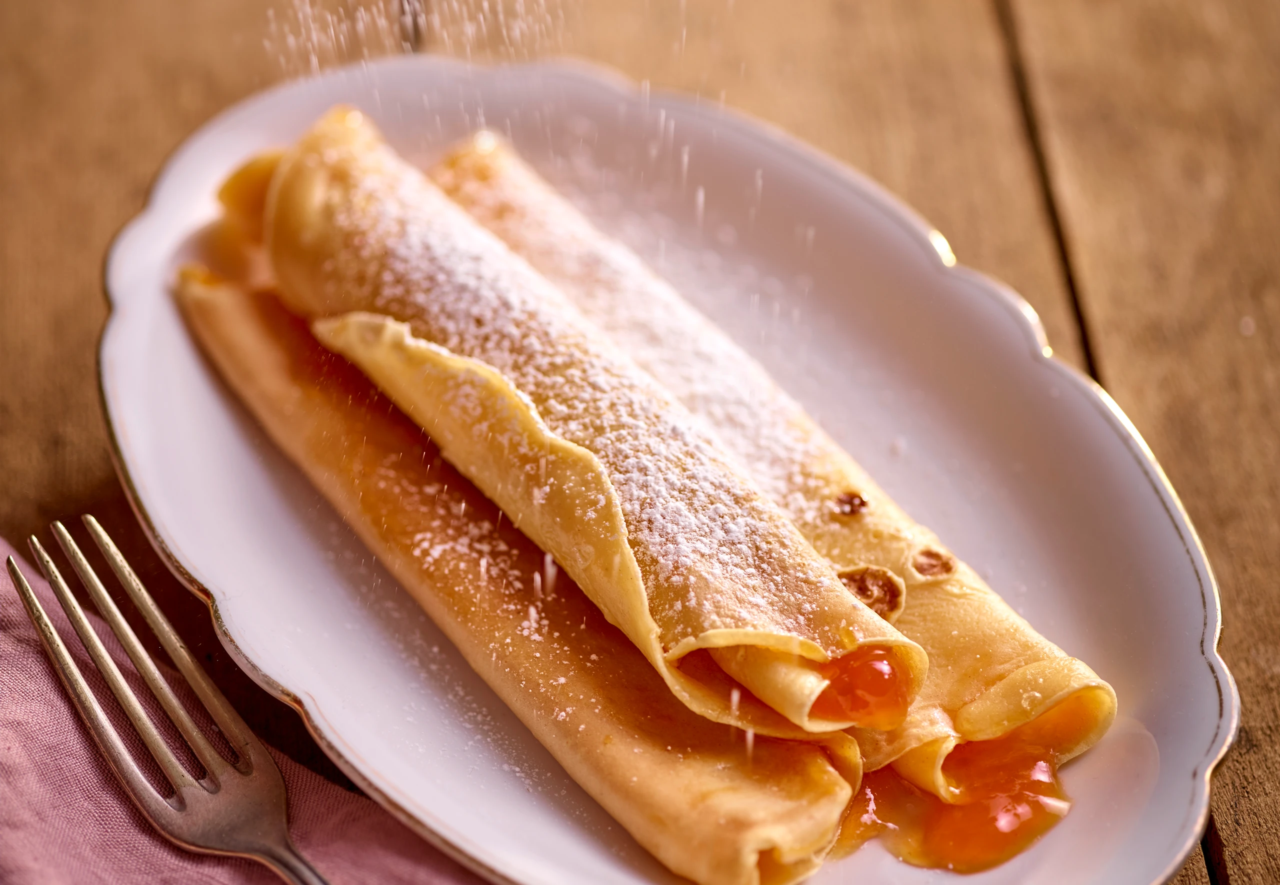 Palatschinken mit Marillenmarmelade füllen und mit Staubzucker bestreut servieren.