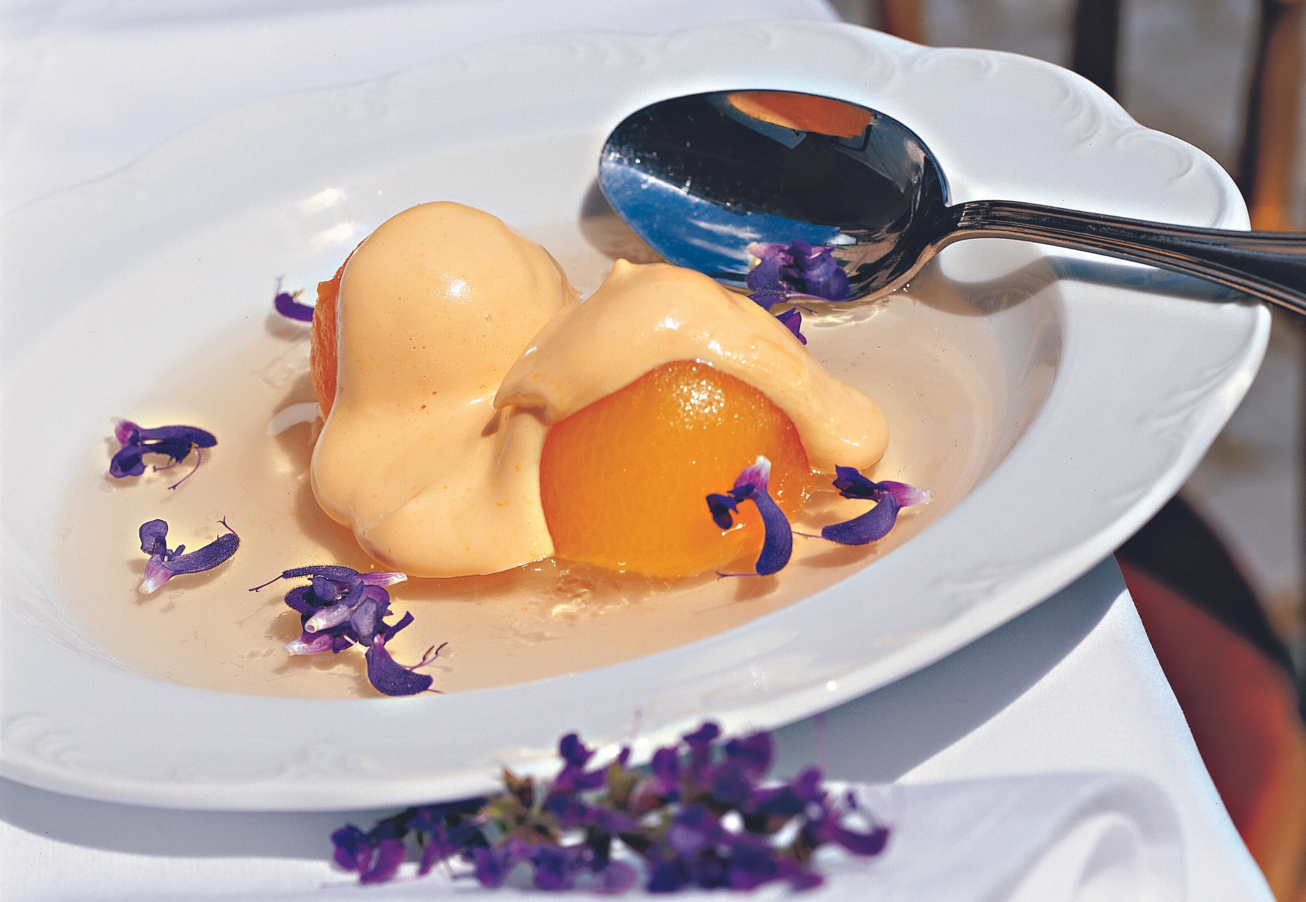 Für das Sabayon Dotter mit Zucker und Likör über Dampf dickcremig aufschlagen. Marillen auf das Gelee legen, mit dem Sabayon übergießen und mit Salbeiblüten garnieren.