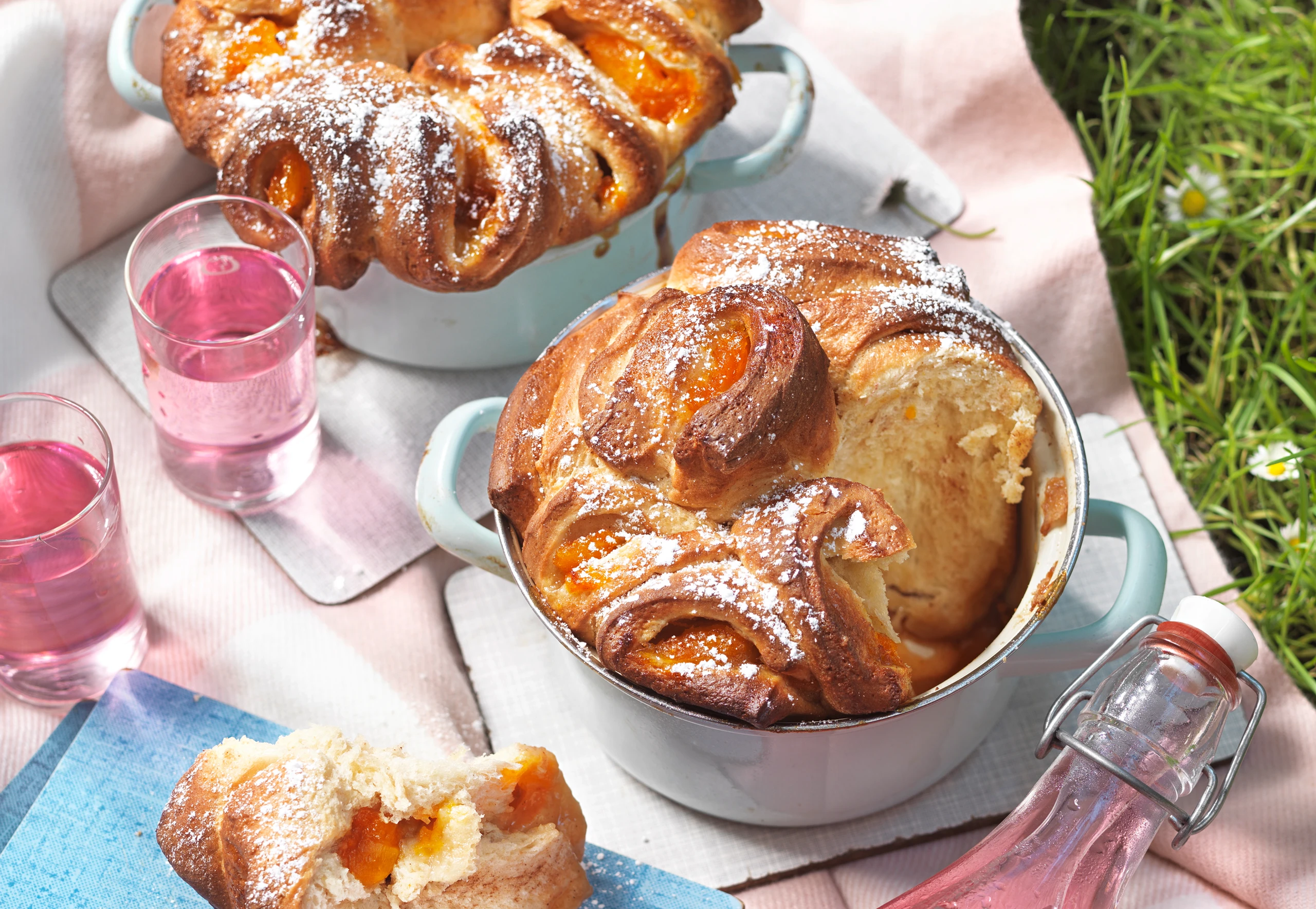 Marillen entkernen, achteln, mit Marmelade vermischen und 3 Minuten köcheln. Mischung umfüllen und mit der Hälfte von Zucker und Zimt vermischen.
