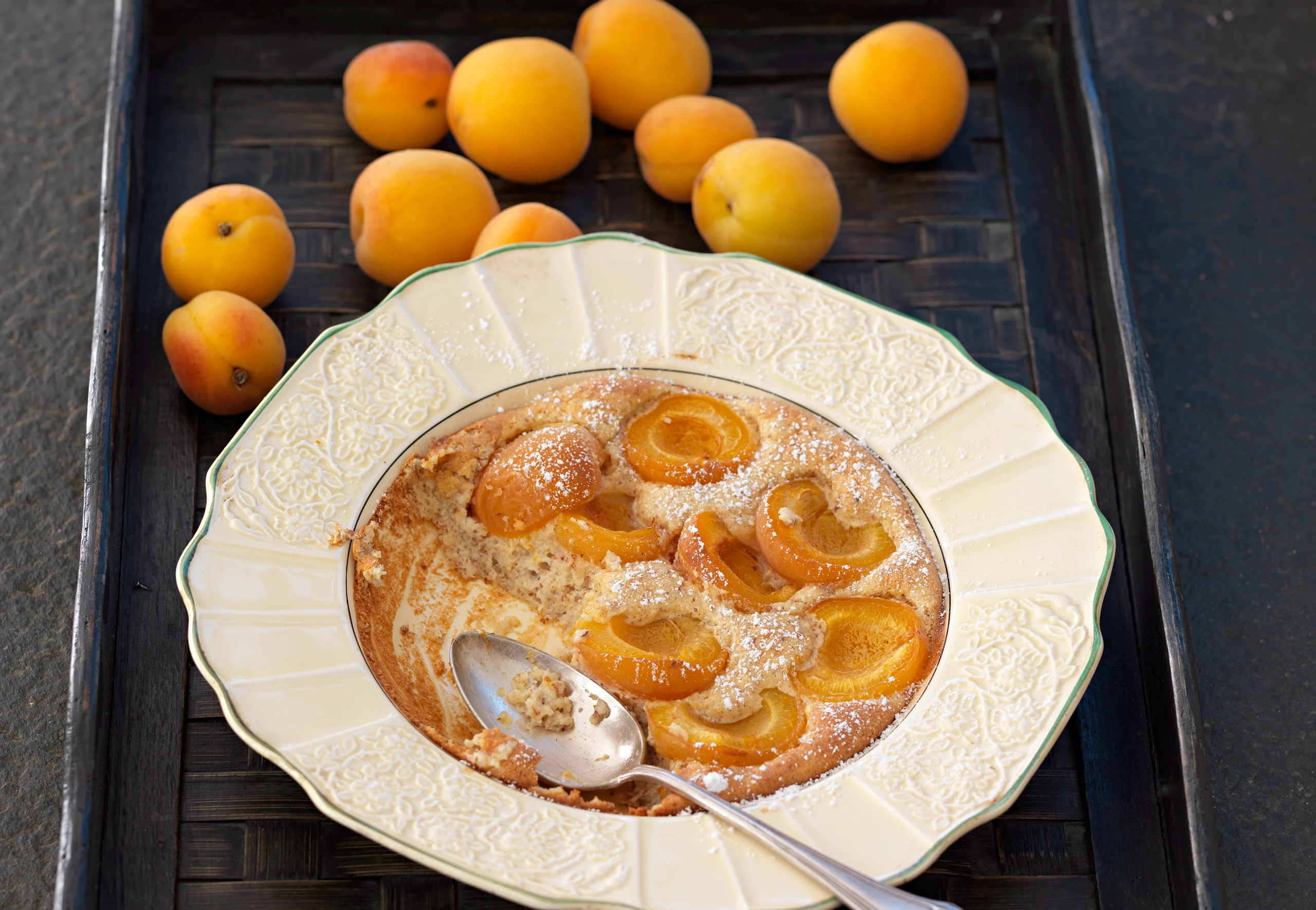 Masse gleichmäßig in den Tellern verteilen und mit den Marillen belegen.