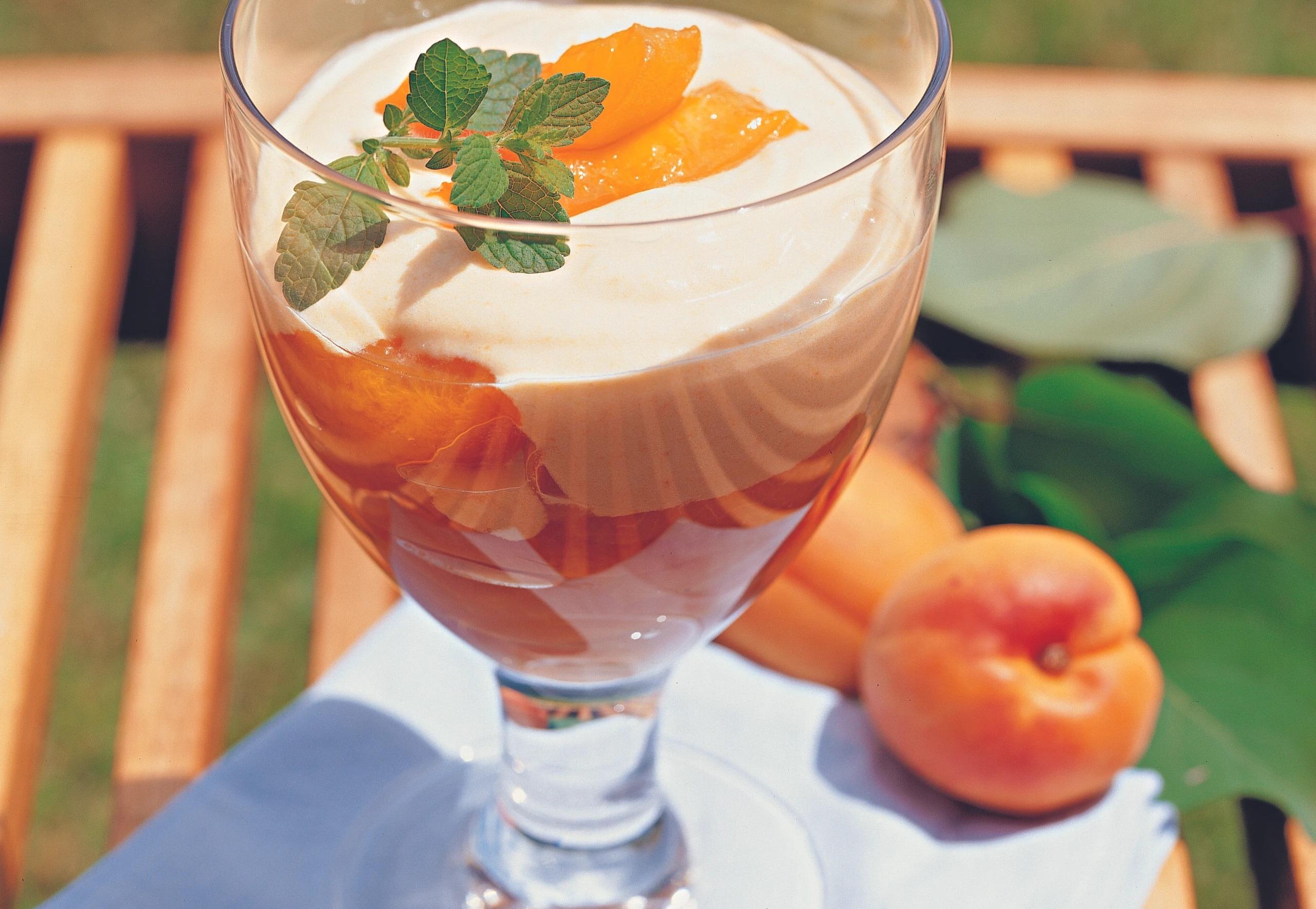 - Für die Creme Marillen waschen, vierteln und entsteinen. Mit Zucker und Zitronensaft vermischen und ca. 10 Minuten weich köcheln. Pürieren und kalt stellen. Ausgekühlt mit Marillenbrand und Sauerrahm vermischen. Schlagobers schlagen und unterheben.