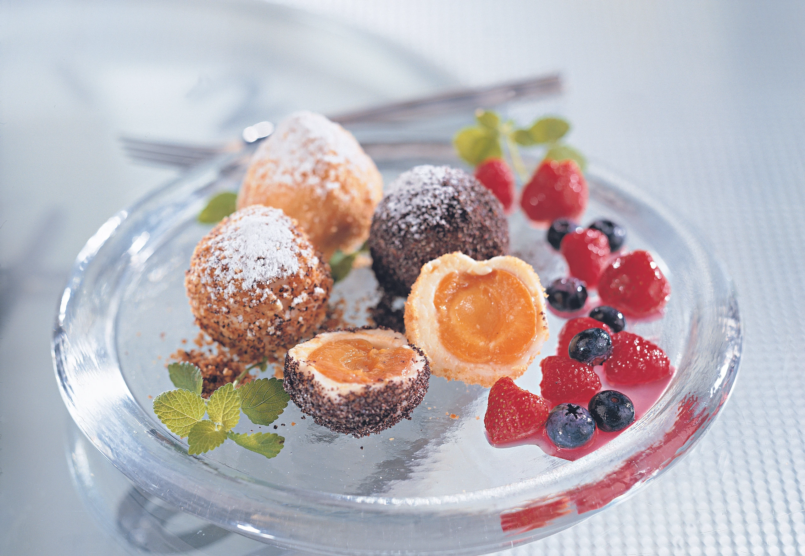 - Knödel aus dem Wasser heben, abtropfen lassen und in der Brösel-, Mohn- oder Nussmischung wälzen. Mit den Beeren anrichten, mit Staubzucker bestreuen und mit Minze garnieren.