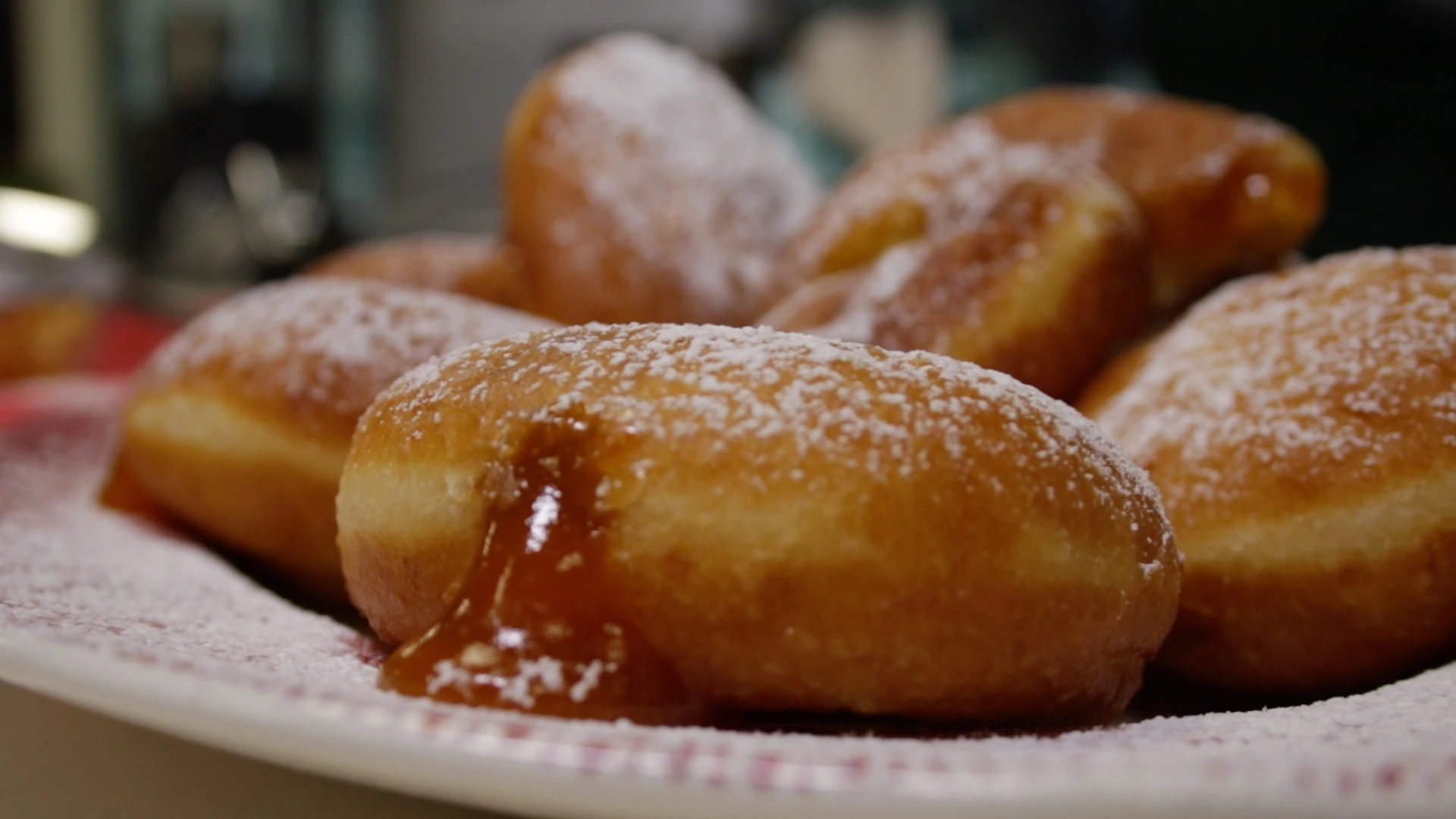 Öl in einem großen Topf auf 160°C erhitzen. Krapfen mit der Oberfläche nach unten in das Öl geben. Topf abdecken und die Krapfen ca. 3 Minuten braun backen, wenden und ca. 2 Minuten fertig backen. Krapfen aus dem Öl nehmen und auf Küchenpapier abtropfen lassen.