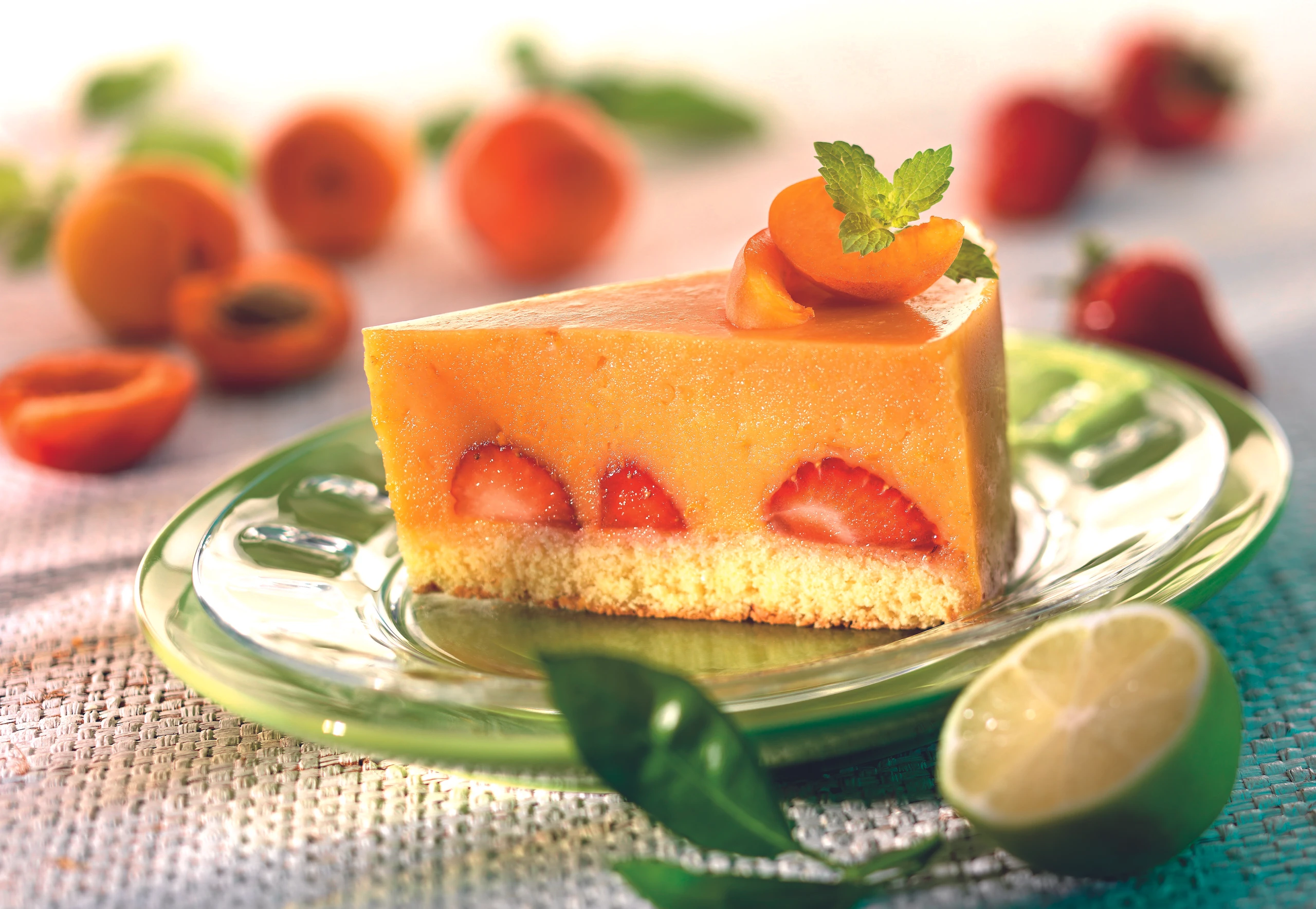 Torte aus der Form lösen, mit Marillenspalten und Minze garniert servieren.