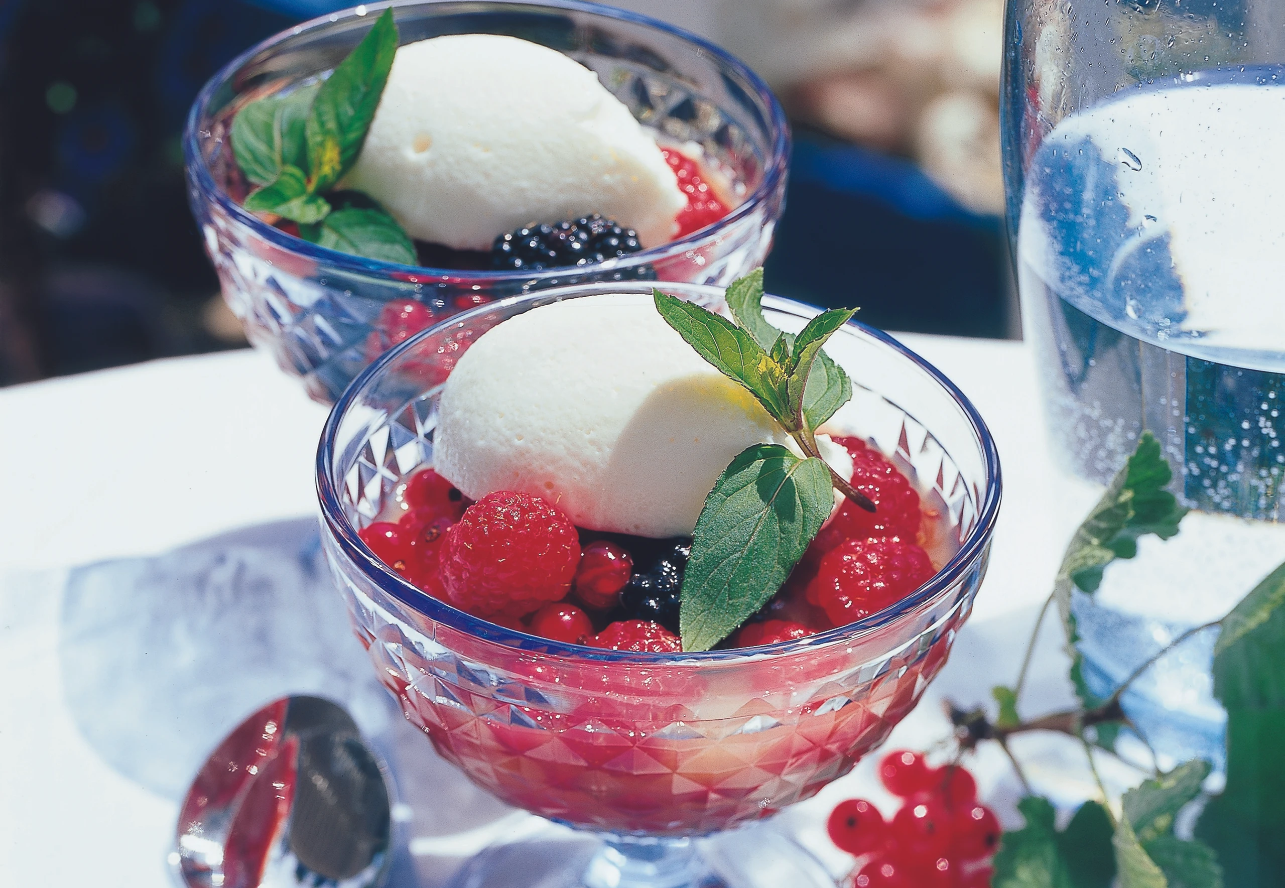 Beeren in gekühlten Gläsern anrichten. Aus der Joghurtcreme mit einem Löffel Nockerl ausstechen (Löffel immer wieder in lauwarmes Wasser tauchen), auf die Beeren setzen und mit Minze garniert servieren.