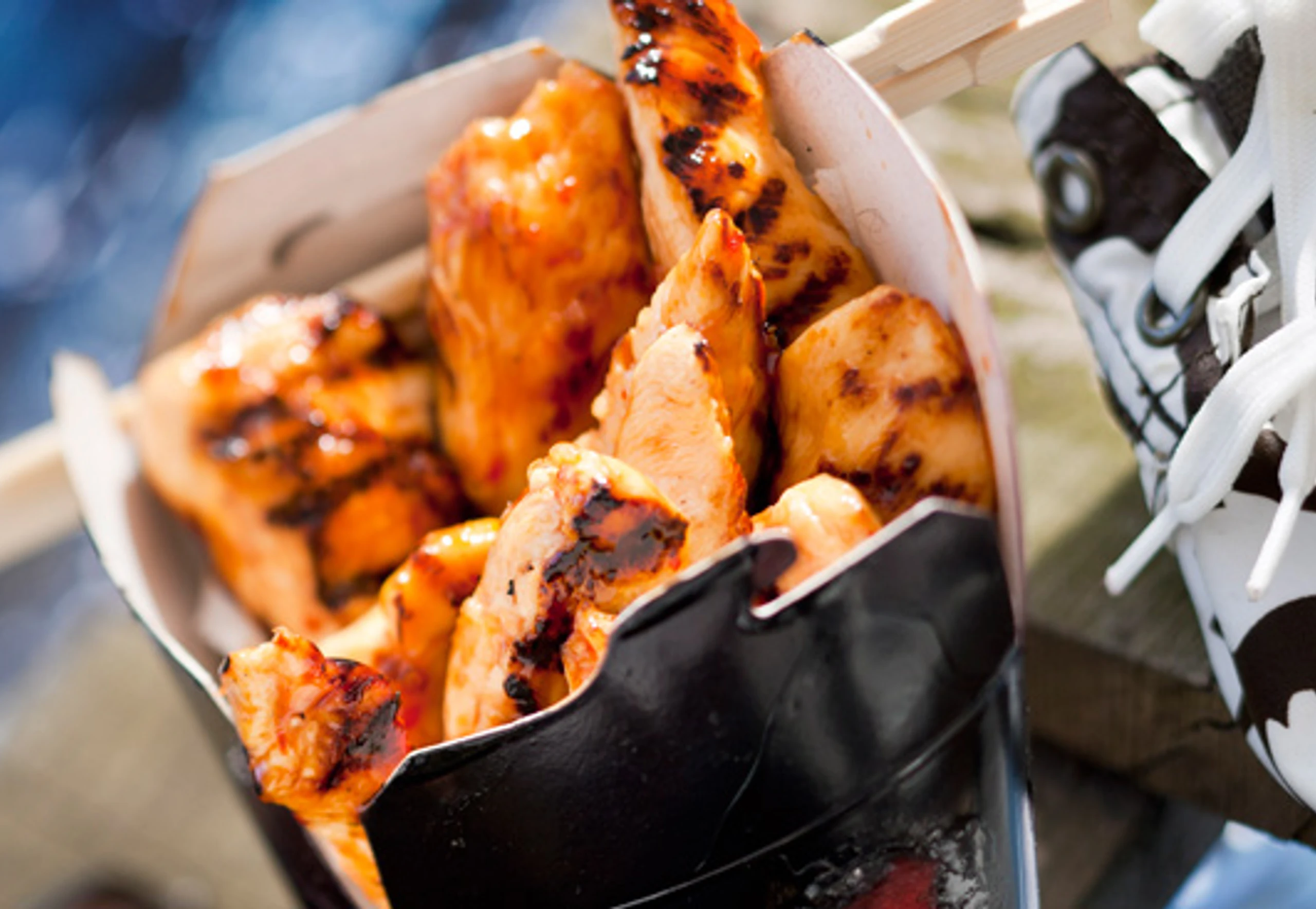 Hühnerbrust in 2,5 cm breite Streifen schneiden, salzen und pfeffern. Für die Marinade Chili- und Sojasauce vermischen. Hühnerstreifen einlegen, mit Frischhaltefolie zudecken und ca. 30 Minuten ziehen lassen.