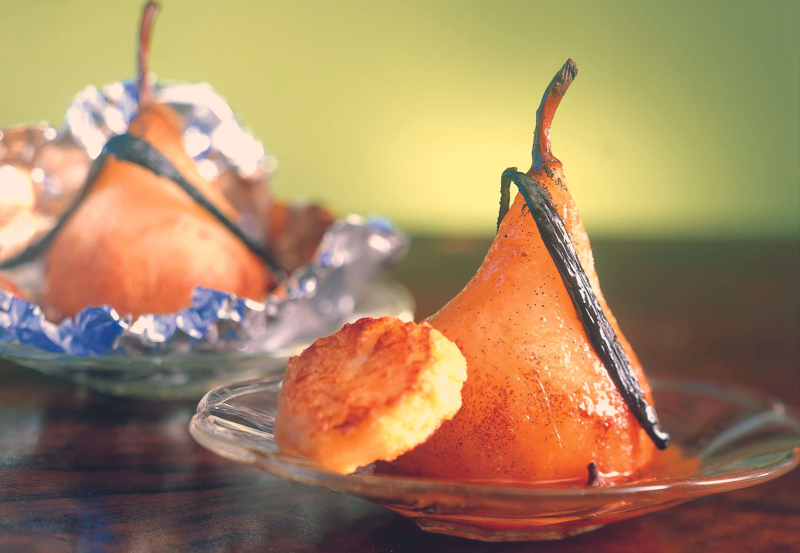 - Birnen mit halbierten Vanilleschoten einreiben, rundum mit der Honigmischung einstreichen (oder darin wenden) und auf die Folienstücke setzen. Birnen mit der restlichen Marinade übergießen, mit den Vanilleschoten und den Gewürznelken belegen. Folienecken über die Birne zur Mitte hin hochziehen und um den Stängel eindrehen.