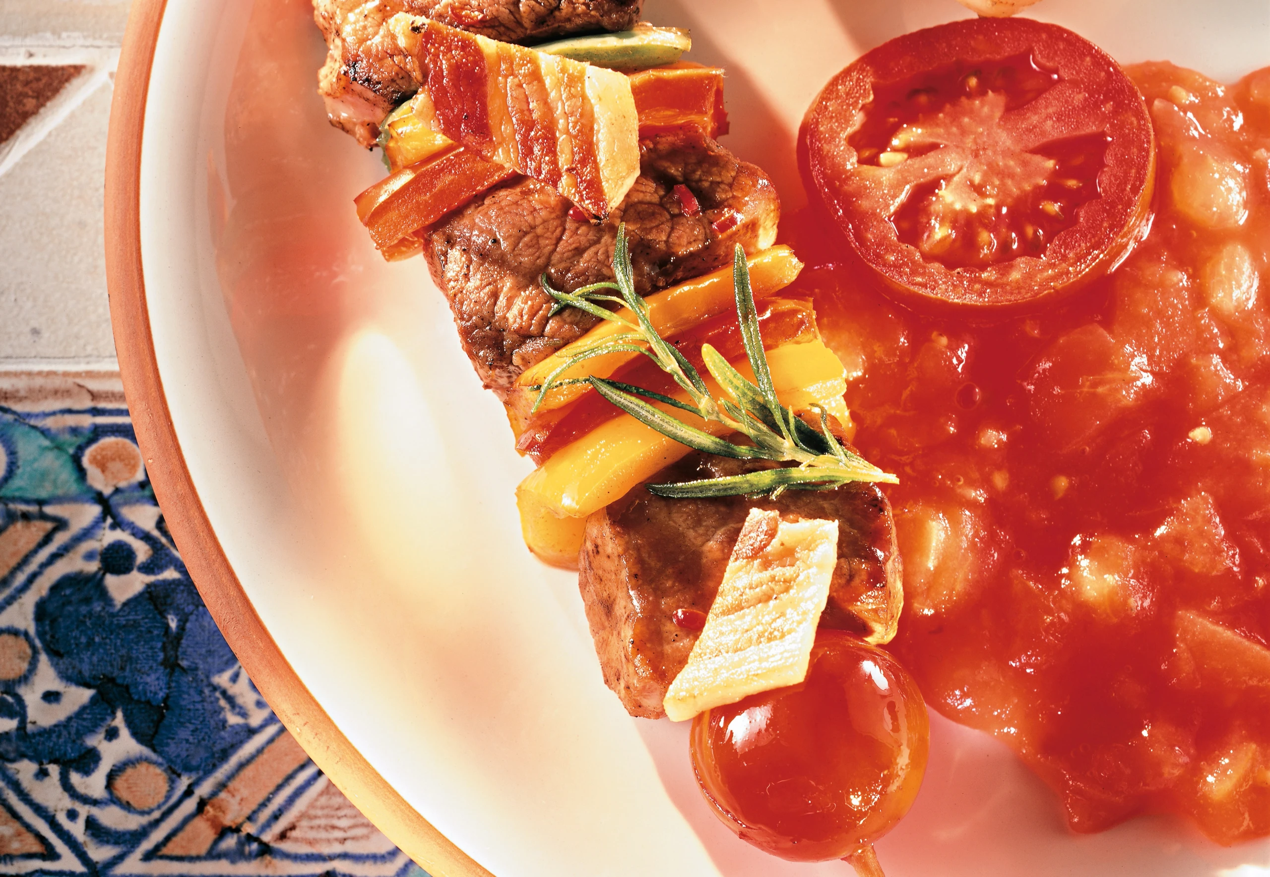 Fleisch zuputzen (von eventuell vorhandenen Häutchen befreien) und jede Sorte in vier gleichgroße Stücke schneiden. Paprika putzen und in Stücke schneiden. Fleisch- und Paprikastücke abwechselnd auf Spieße stecken, an die Enden der Spieße je einen Kirschparadeiser stecken.