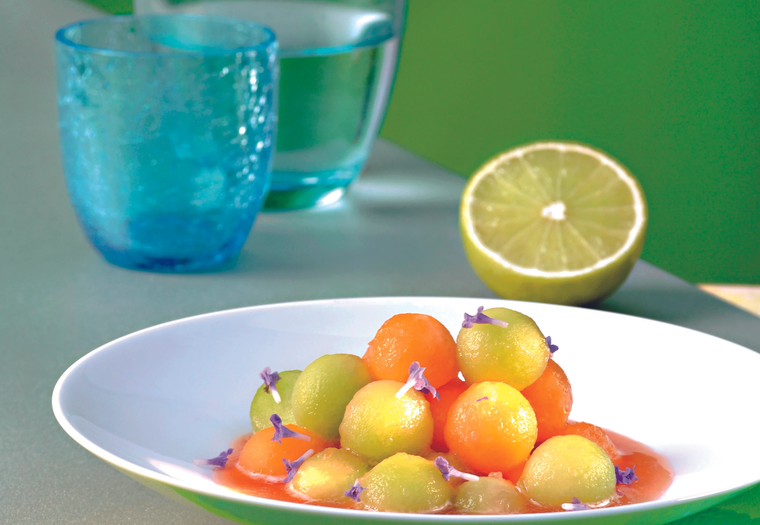 Melonen mit der Marinade anrichten, eventuell mit Lavendelblüten bestreuen.