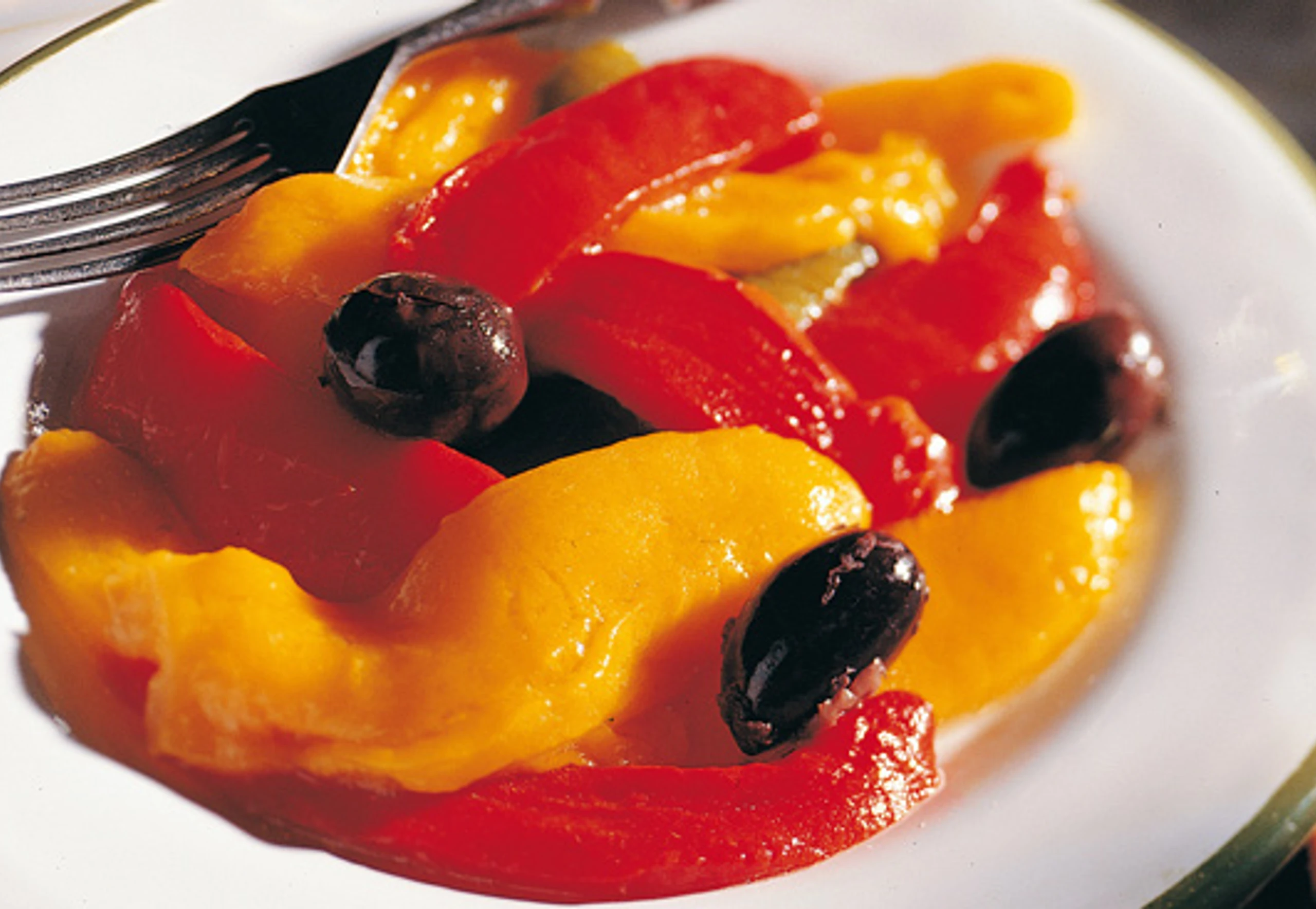 Zwiebel schälen und fein hacken. Paprika und Zwiebel mit Essig und Öl vermischen, mit Salz und Pfeffer würzen, zudecken und für ca. 2 Stunden kühl stellen. Paprika mit Oliven garniert servieren.