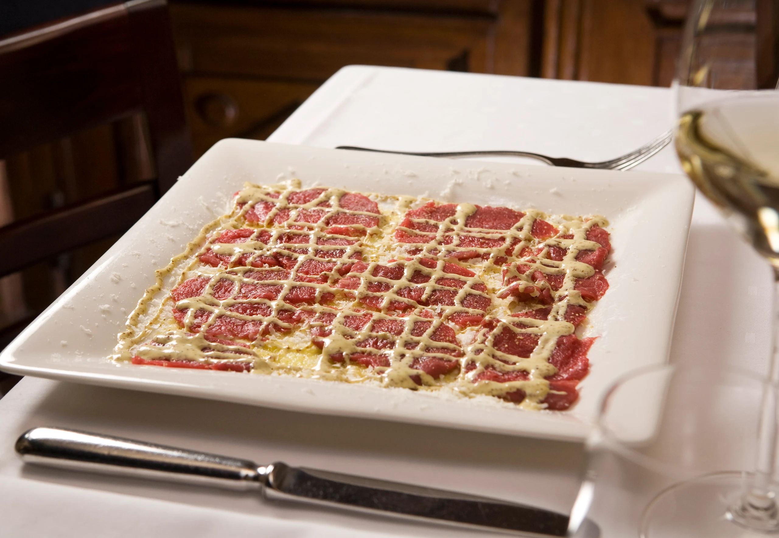 Rindsfilet von eventuell vorhandenen Häutchen befreien und in möglichst dünne Scheiben schneiden. Filet portionsweise zwischen ein aufgeschnittenes Tiefkühlsäckchen legen und mit einem Rollholz dünn ausrollen. Folienoberseite abziehen. Fleisch mit der anhaftenden Folie auf die Teller stürzen. Folie abziehen.