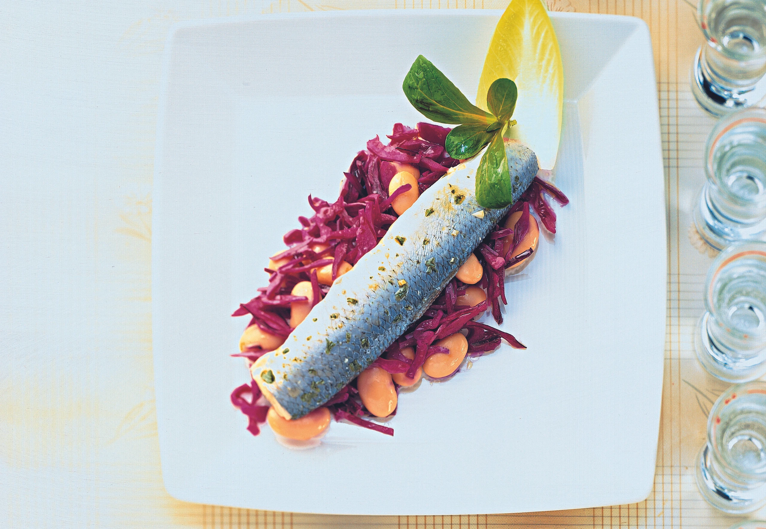Marinierte Russenfilets auf Rotkraut-Bohnensalat