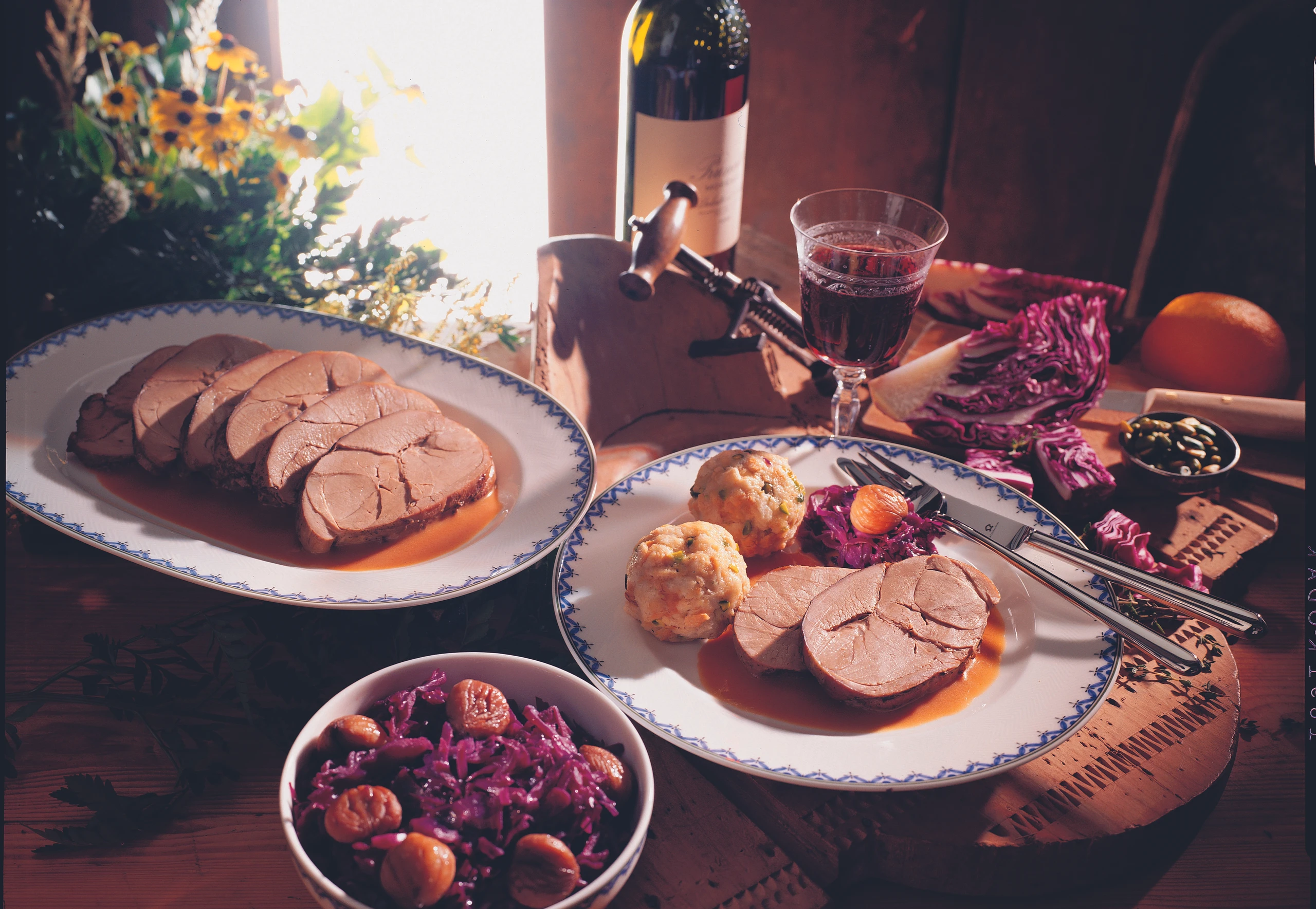 Fleisch aus dem Rohr nehmen und warmstellen. Bratensaft abgießen und abseihen, Crème fraîche einrühren und auf kleiner Flamme ca. 5 Minuten köcheln. Hagebutten-Marmelade untermischen und die Sauce mit einem Stabmixer aufschlagen. Fleisch quer zur Faser in gleichdicke Scheiben schneiden und mit der Sauce anrichten. Als Beilage serviert man Rotkraut mit Maroni oder Äpfeln.