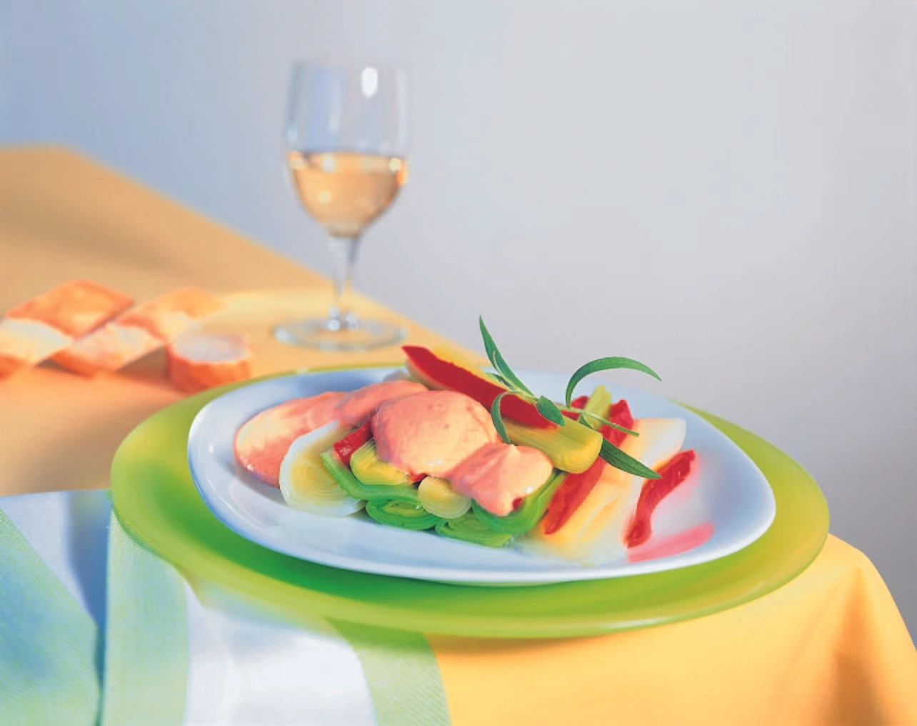 Lauch aus dem Kochfond heben, gut abtropfen lassen und mit den Paprikastreifen und der Tofumarinade auf Tellern anrichten. Gemüse mit Estragonblättchen garniert servieren.
