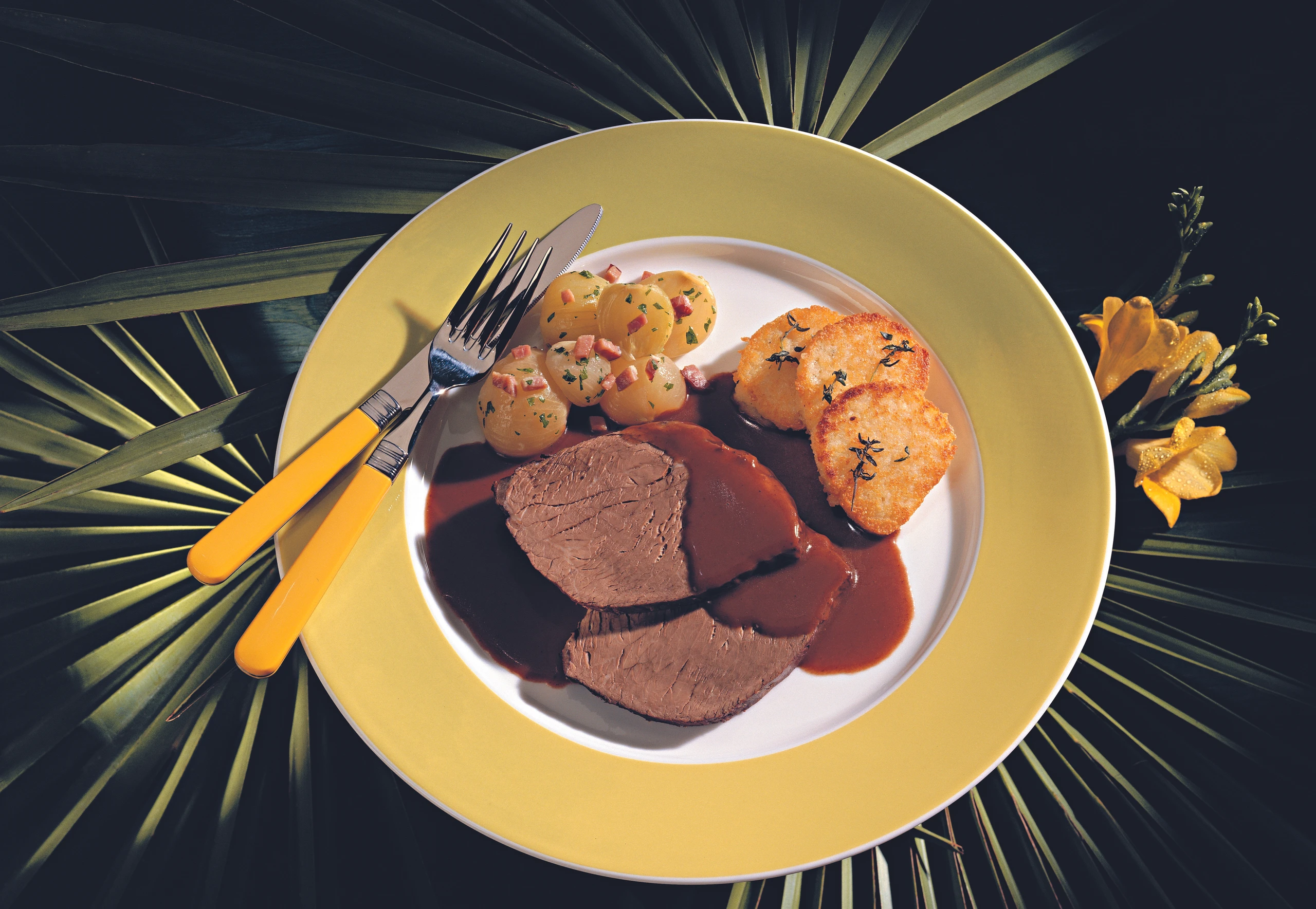 Braten herausheben, in Scheiben schneiden und mit der Sauce und den vorher zubereiteten Beilagen (siehe Rezepte) anrichten.