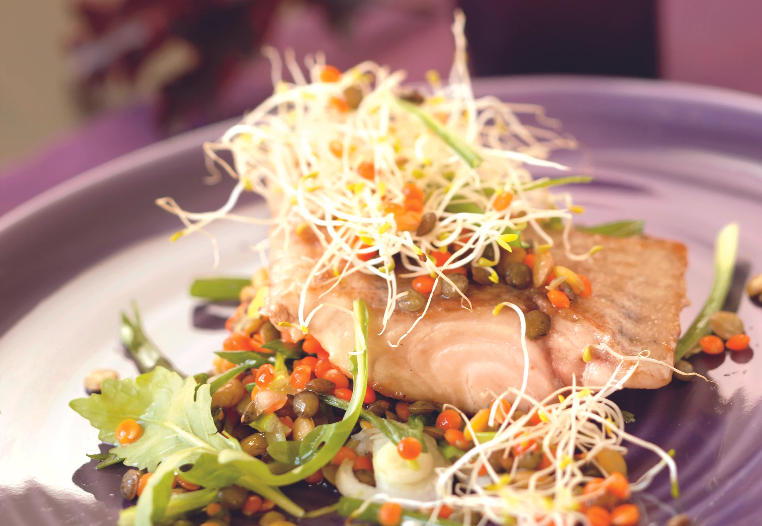 - Butter bis zum Aufschäumen erhitzen, Filets einlegen, darin beidseitig braten (dauert ca. 8 Minuten) und mit Bratfett übergießen. Sprossen und Rucola unter den Salat mischen. Salat mit den Filets anrichten.