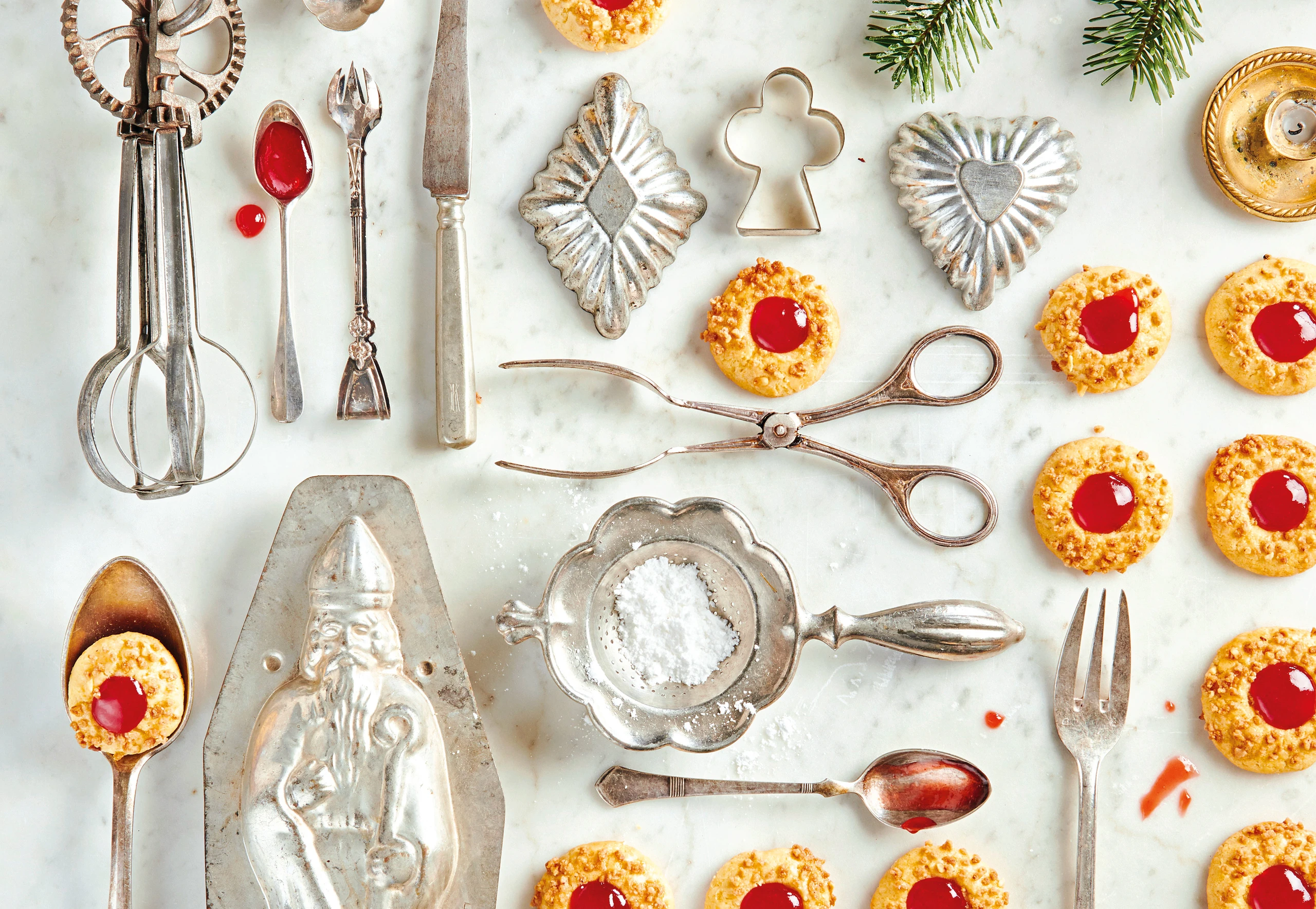 Mit einem Kochlöffelstiel in jede Kugel eine Vertiefung drücken. Kugeln auf die Bleche legen und nacheinander im Rohr (mittlere Schiene) ca. 12 Minuten backen, herausnehmen und auskühlen lassen.