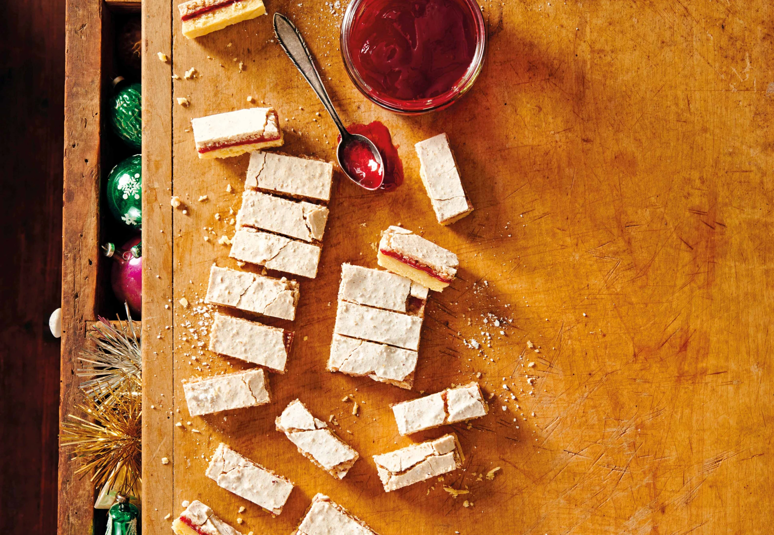 Eiklar und Staubzucker steif und glänzend schlagen. Nüsse unterheben. Marmelade auf dem Teig verstreichen. Baiser darauf glatt streichen. Im Rohr (mittlere Schiene) ca. 35 Minuten backen. Herausnehmen und auskühlen lassen. Schnitte in gleichmäßige Stücke schneiden.