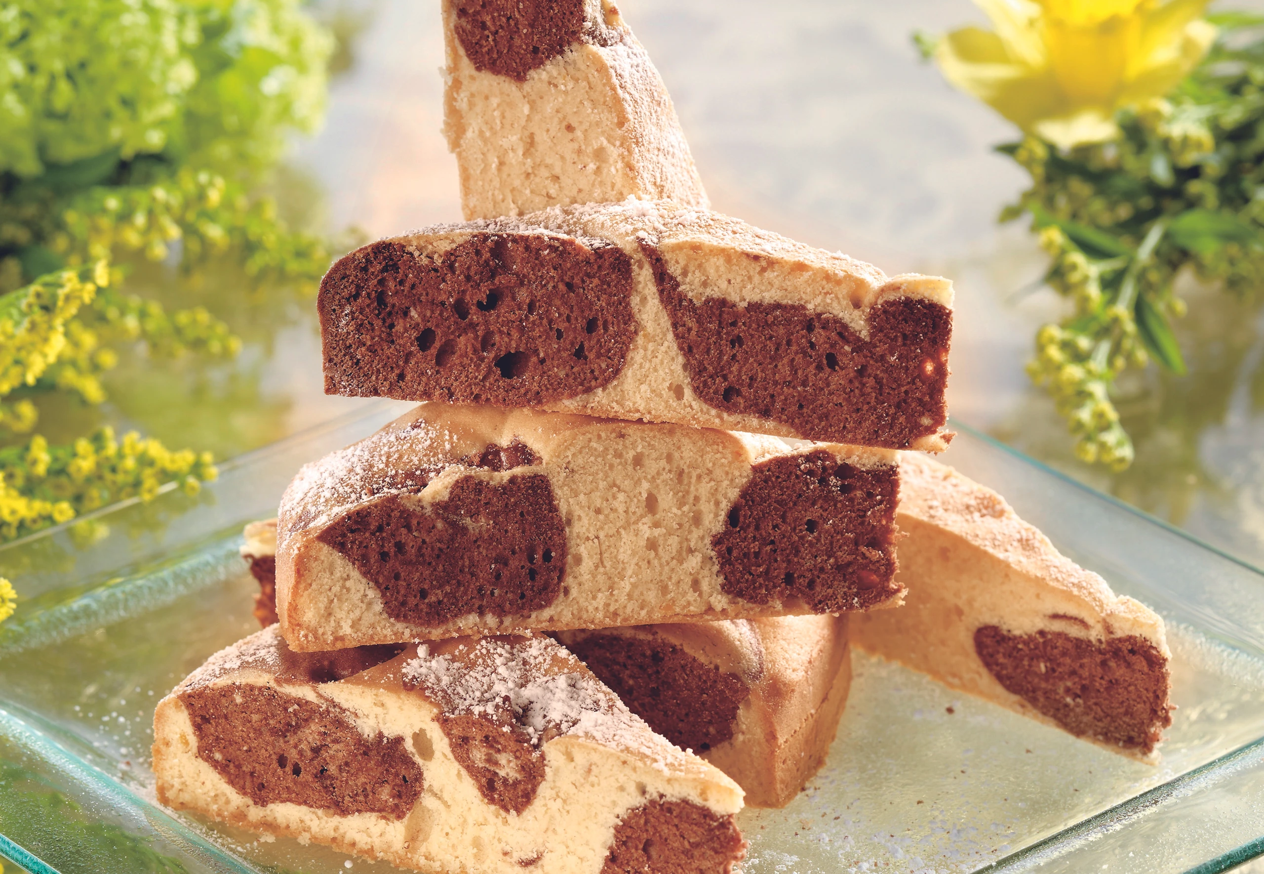 Mehl, dann zerlassene Butter nach und nach unter die Masse heben. Masse teilen und eine Hälfte mit Kakao einfärben. Helle Masse in der Form verteilen, dunkle Masse löffelweise auf die helle setzen und behutsam hineindrücken.