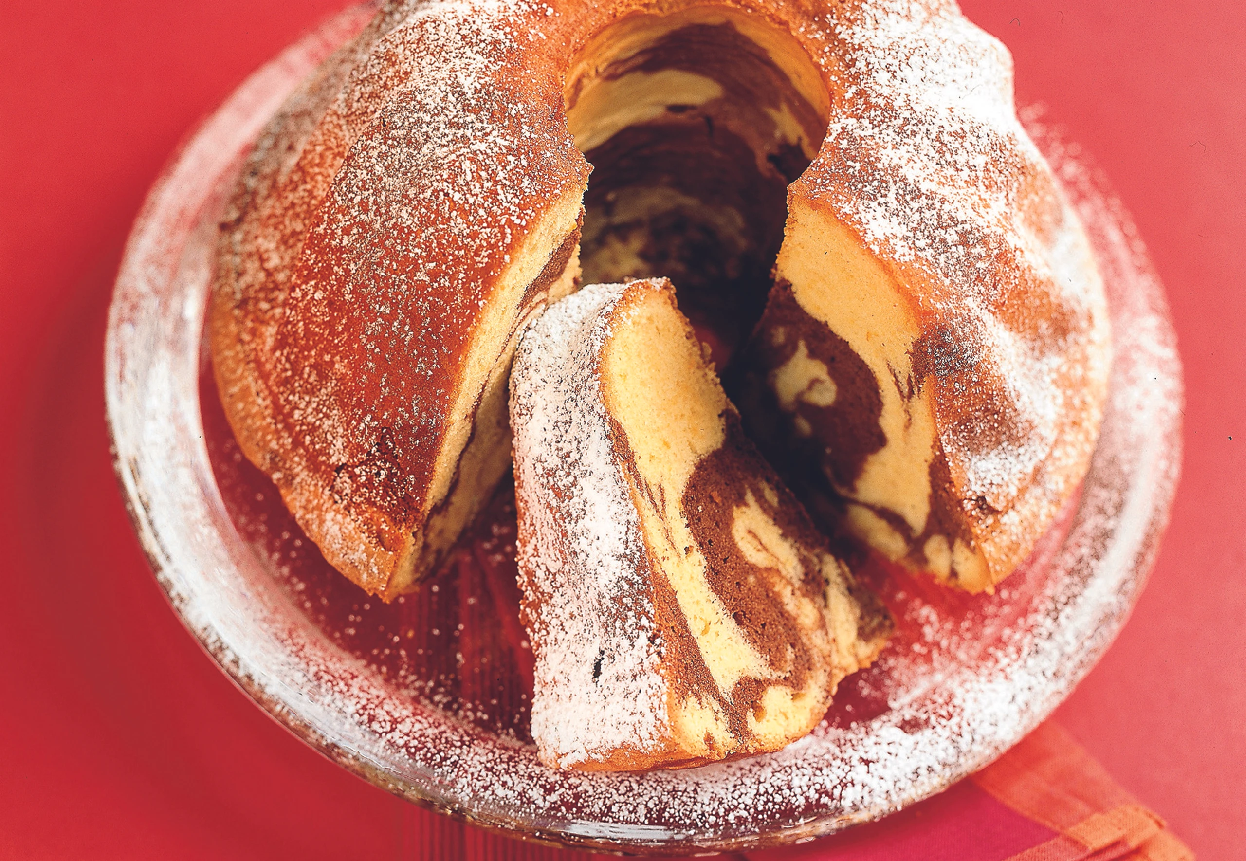 Die Hälfte der Masse mit der Kakaomischung einfärben. Helle und dunkle Masse abwechselnd in die Form füllen. Mit einem Spieß Kreise in die Kuchenmasse ziehen.