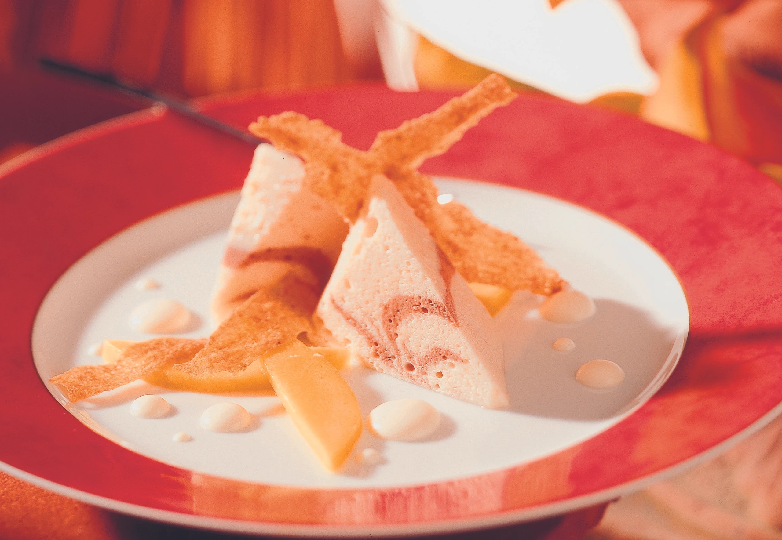 Zum Anrichten die Terrine aus der Form stürzen und die Folie abziehen. Terrine in Scheiben schneiden, mit Mangoscheiben, Sauerrahmsauce und den Bananen-Chips garnieren.
