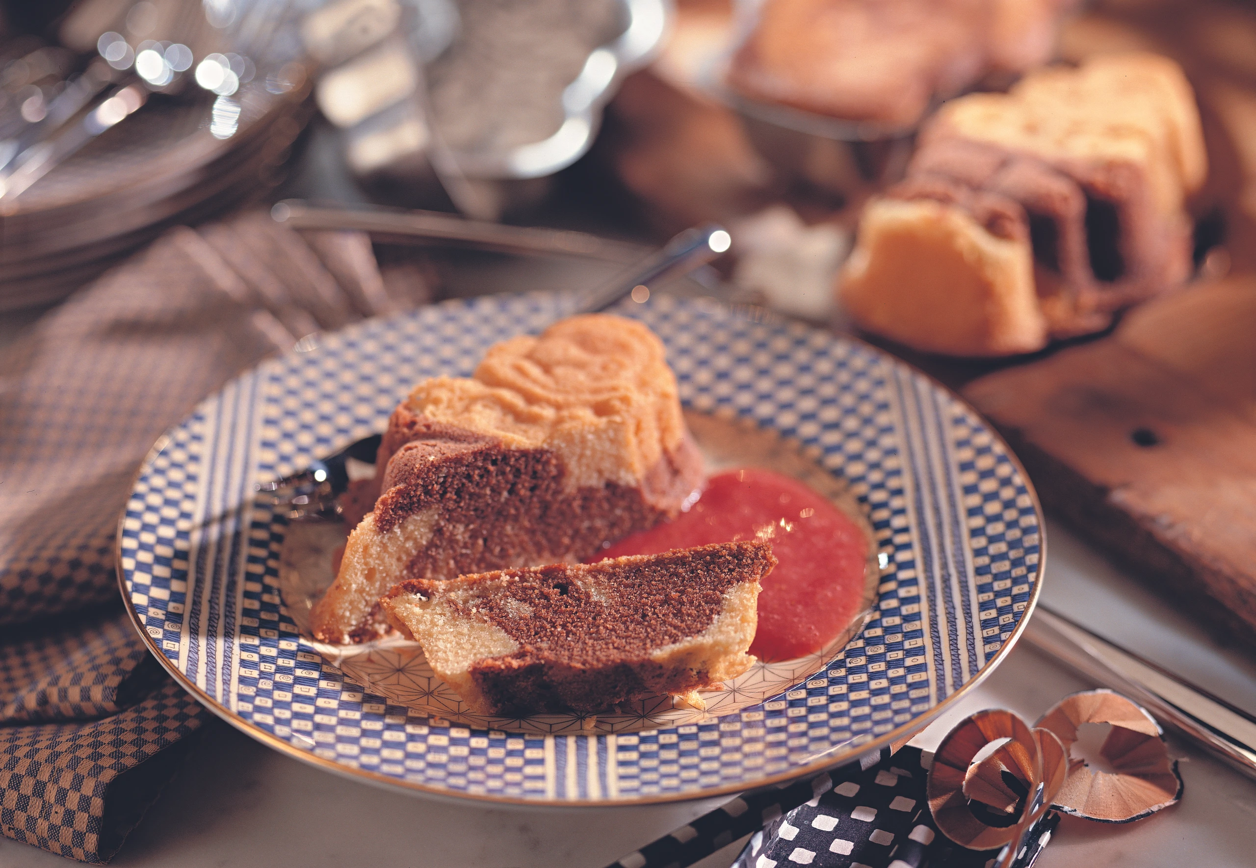 Kuchen aus dem Rohr nehmen, kurz rasten lassen, aus den Formen stürzen, auskühlen lassen und mit Erdbeersauce Marmorierte Clownsanrichten.