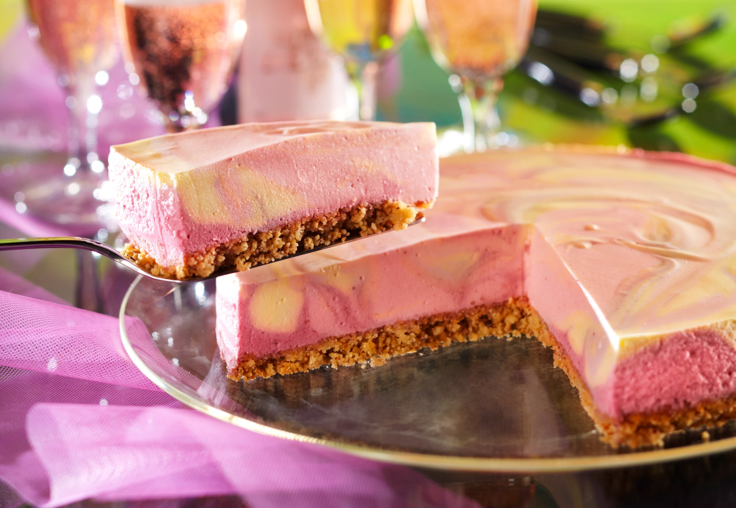 Cremen nacheinander in die Form füllen. Mit einem Kochlöffelstiel Kreise durchziehen. Torte mit Frischhaltefolie zugedeckt für ca. 5 Stunden kühl stellen.