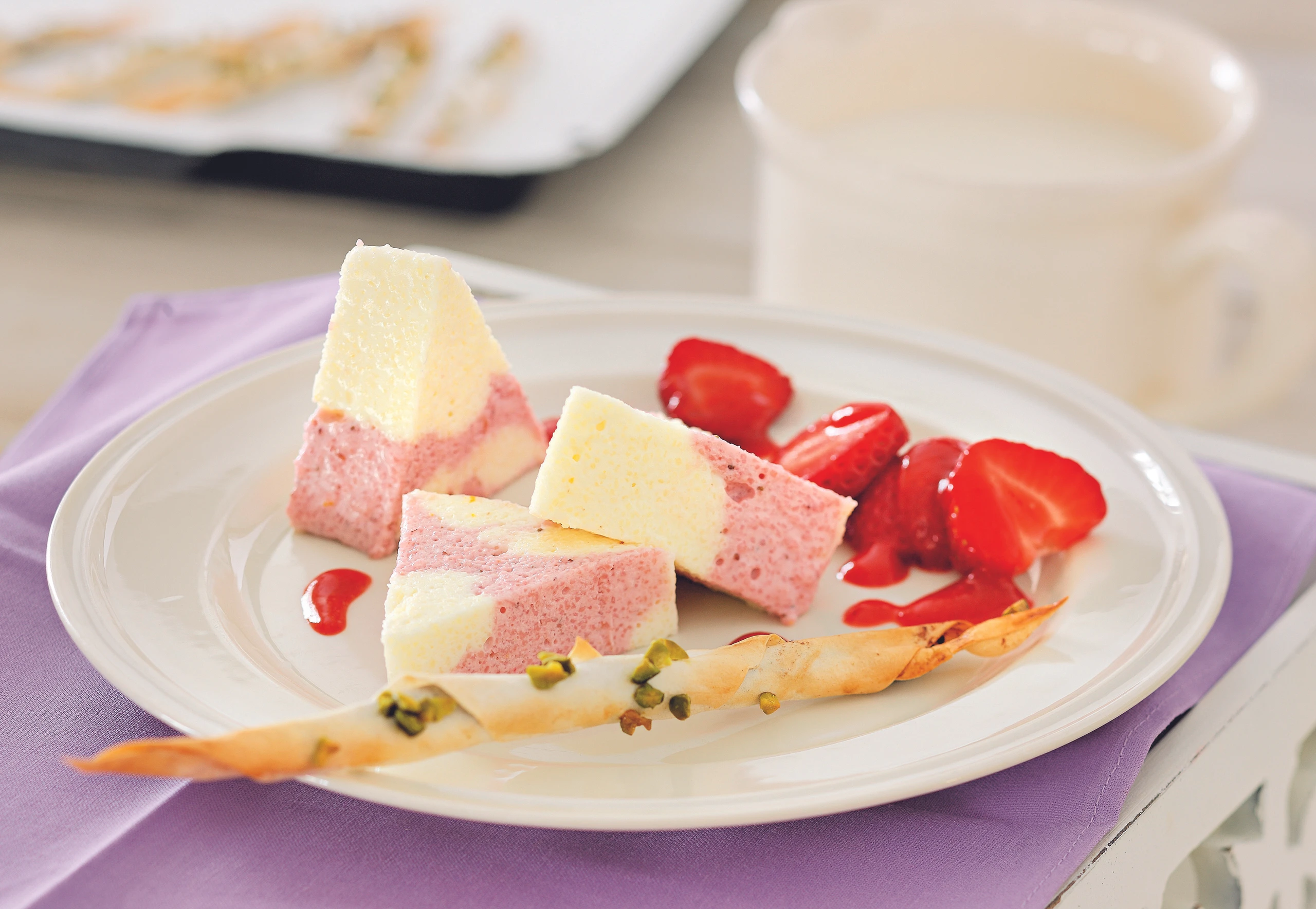 Obers cremig schlagen und unter die Masse heben. Die Hälfte mit dem Erdbeerpüree verrühren. Massen abwechselnd in die Form füllen, mit Frischhaltefolie zudecken und für 4 Stunden kühl stellen.