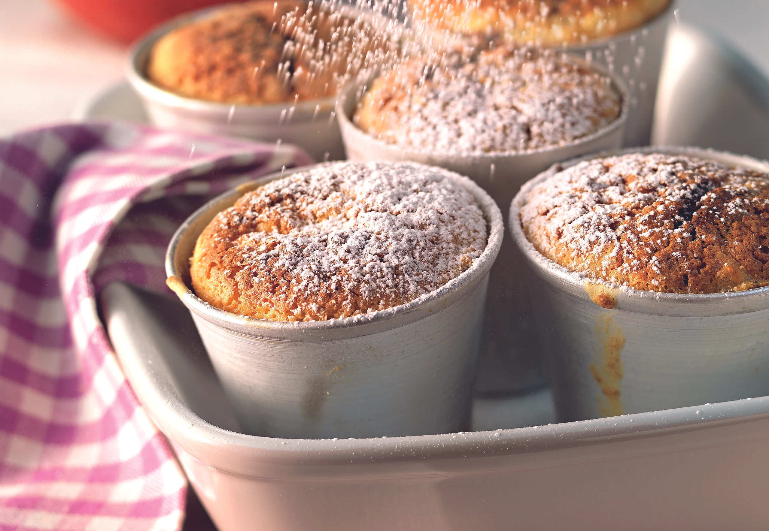 Aufläufe aus den Förmchen stürzen, anrichten, mit Staubzucker bestreuen und mit Himbeersauce garniert servieren.