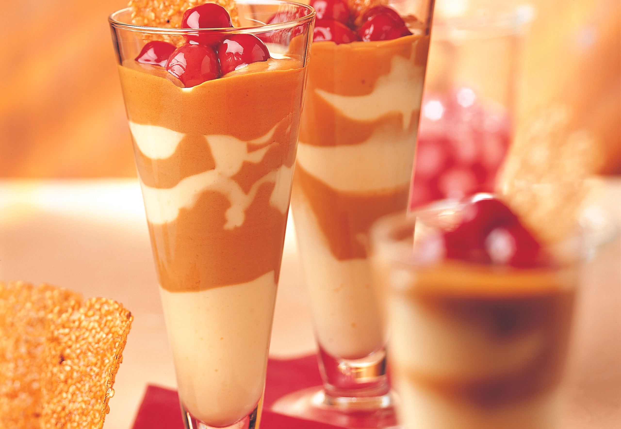 Massen abwechselnd in die Gläser füllen, mit Frischhaltefolie zudecken und zum Festwerden ca. 6 Stunden kühlen. Mousse mit Hippen und Weichseln garniert servieren.
