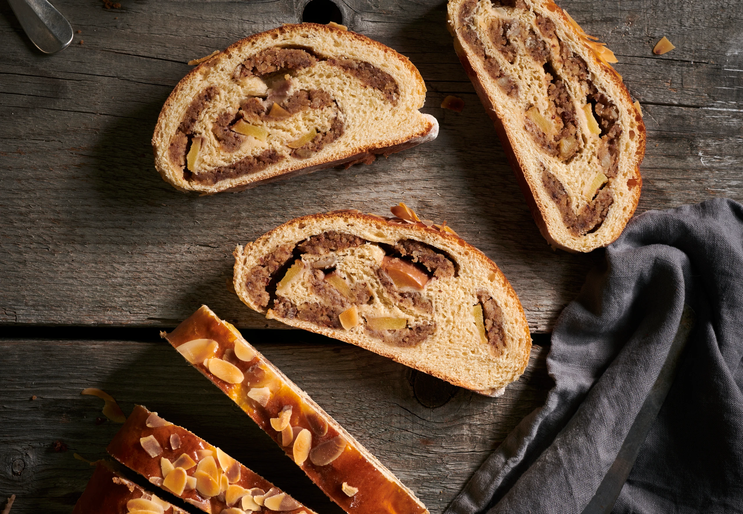 Rohr auf 180°C vorheizen. Backblech mit Backpapier belegen. Teig auf einer bemehlten Arbeitsfläche zu einem Rechteck ausrollen. Fülle darauf verteilen. Birne schälen, Kerngehäuse entfernen. Birne in Stücke schneiden und auf der Fülle verteilen. Teig von unten nach oben eng aufrollen. Strudel auf das Blech legen, mit Ei bestreichen und mit den Mandelblättchen bestreuen. Im Rohr (mittlere Schiene) ca. 30 Minuten goldbraun backen. Herausnehmen und abkühlen lassen.