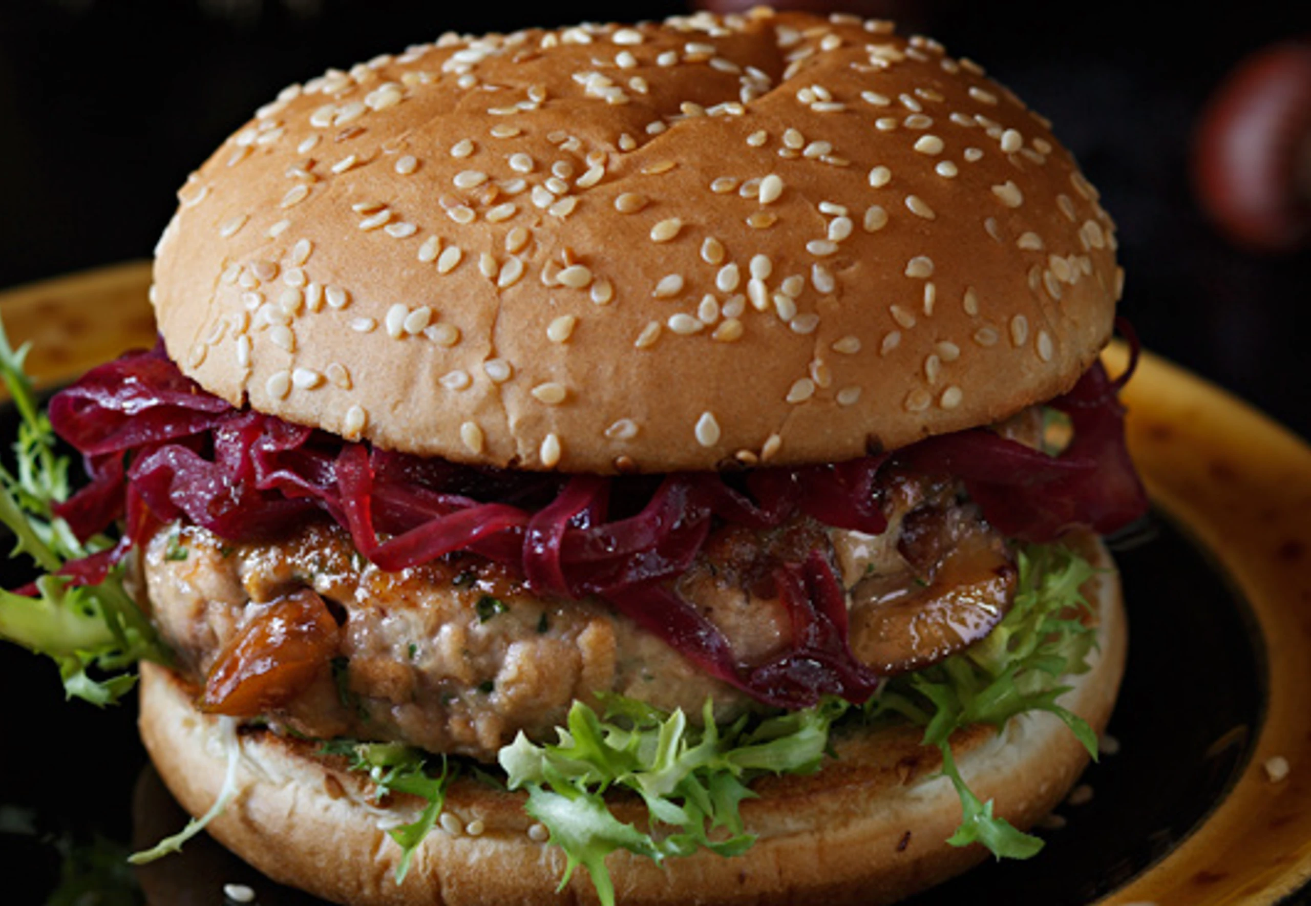 Buns mit Friséesalat, Laibchen und Rotkrautsalat belegen, Deckel darauflegen und leicht andrücken.