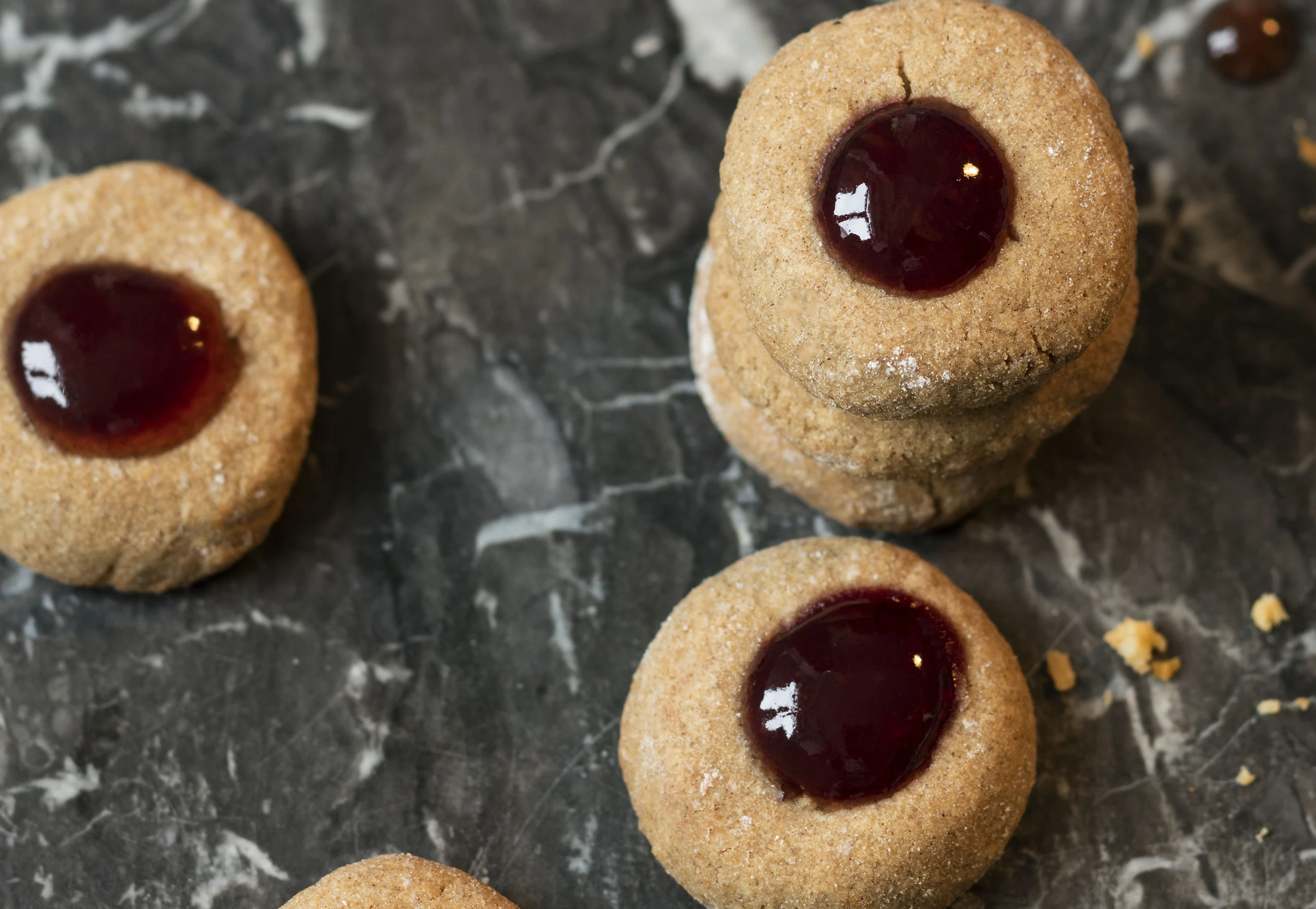 Rohr auf 190°C vorheizen. 2 Backbleche mit Backpapier belegen. Teig zu einer 2 cm dicken Rolle formen, davon ca. 2 cm große Stücke abschneiden. Teigstücke zu Kugeln formen, auf die Bleche legen, mit einem Kochlöffelstiel eine Vertiefung in die Mitte drücken.