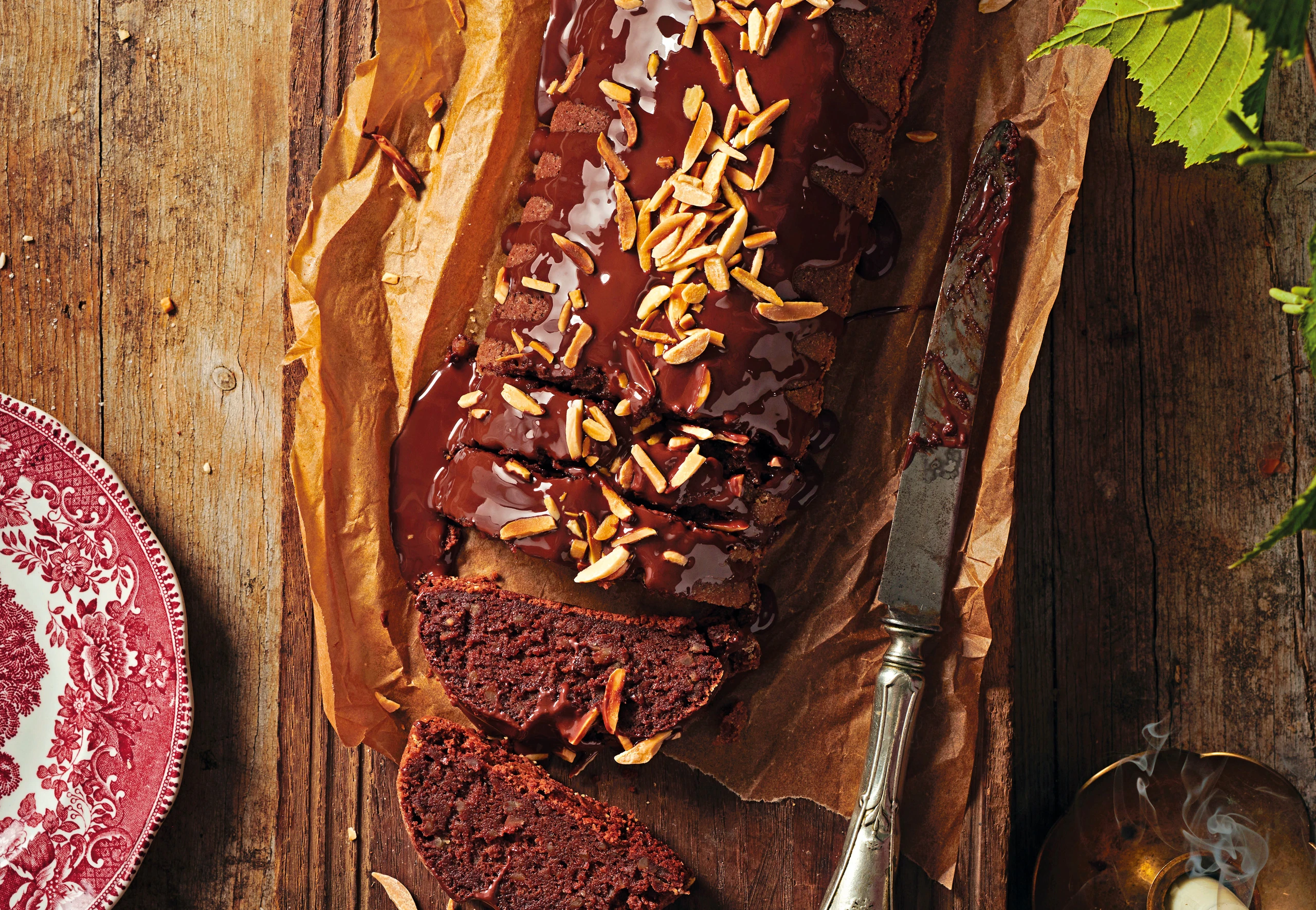 Rehrücken mit der Glasur übergießen und mit den Mandelstiften bestreuen.