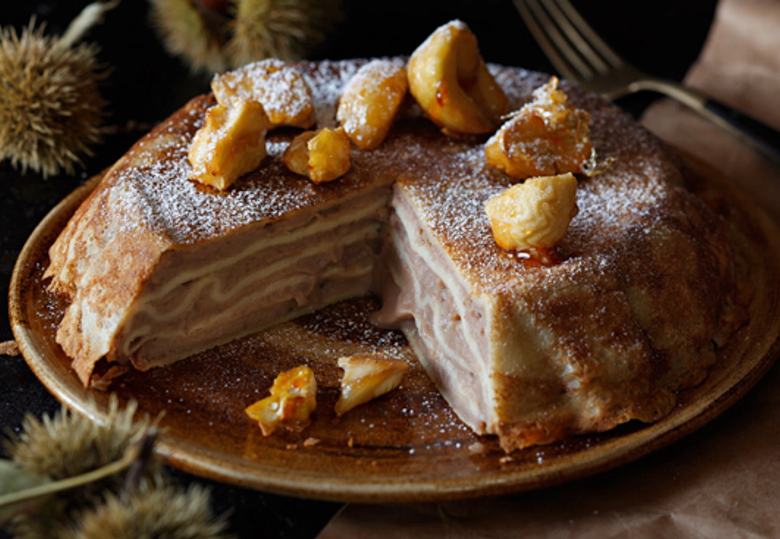 Formenboden mit einer Palatschinke auslegen, ein Viertel von der Maronicreme darauf verstreichen. Restliche Palatschinken und übrige Creme abwechselnd in die Form schichten, mit einer Palatschinke abschließen. Torte mit Alufolie abdecken und im Rohr (mittlere Schiene/ Gitterrost) ca. 40 Minuten backen.