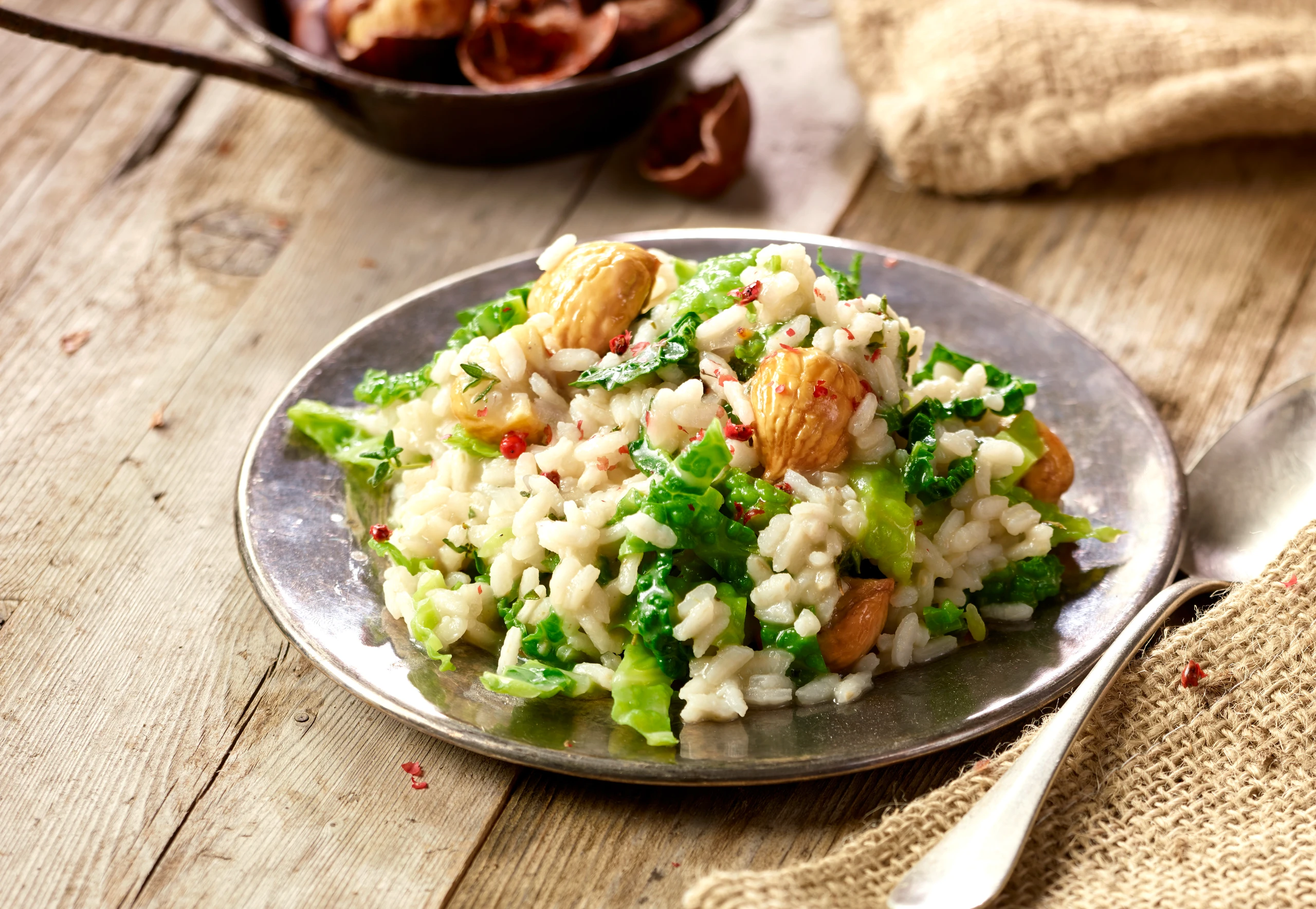 Zwiebeln und Reis in 1 EL Butter glasig anschwitzen, mit der Hälfte von der Suppe aufgießen und unter Rühren köcheln. Wenn die Flüssigkeit eingekocht ist, übrige Suppe nach und nach zugießen. Kohlstreifen und Apfelmus unterrühren und mitgaren. Am Ende der Garzeit soll das Risotto cremig sein.