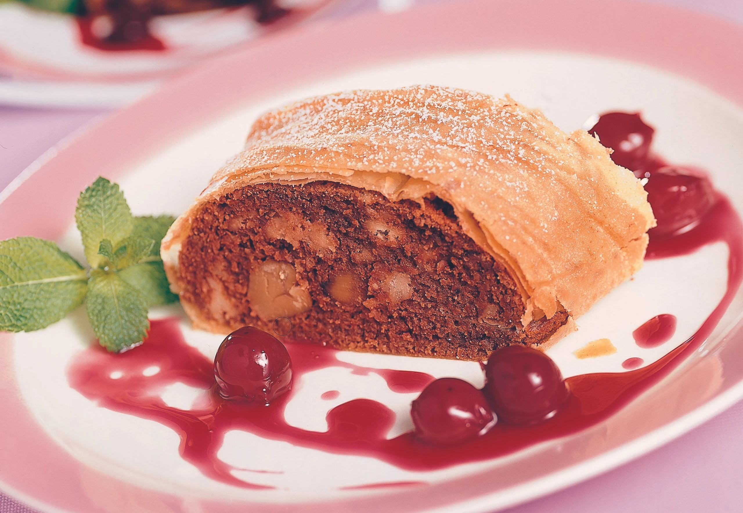 Strudel auf das Backblech legen, mit Butter bestreichen und im vorgeheizten Rohr (mittlere Schiene) ca. 35 Minuten goldgelb backen. Strudel aus dem Rohr nehmen, kurz rasten lassen, dann in Stücke schneiden. Strudel mit den Weinkirschen anrichten, mit Staubzucker bestreuen und mit Minzeblättern garnieren.