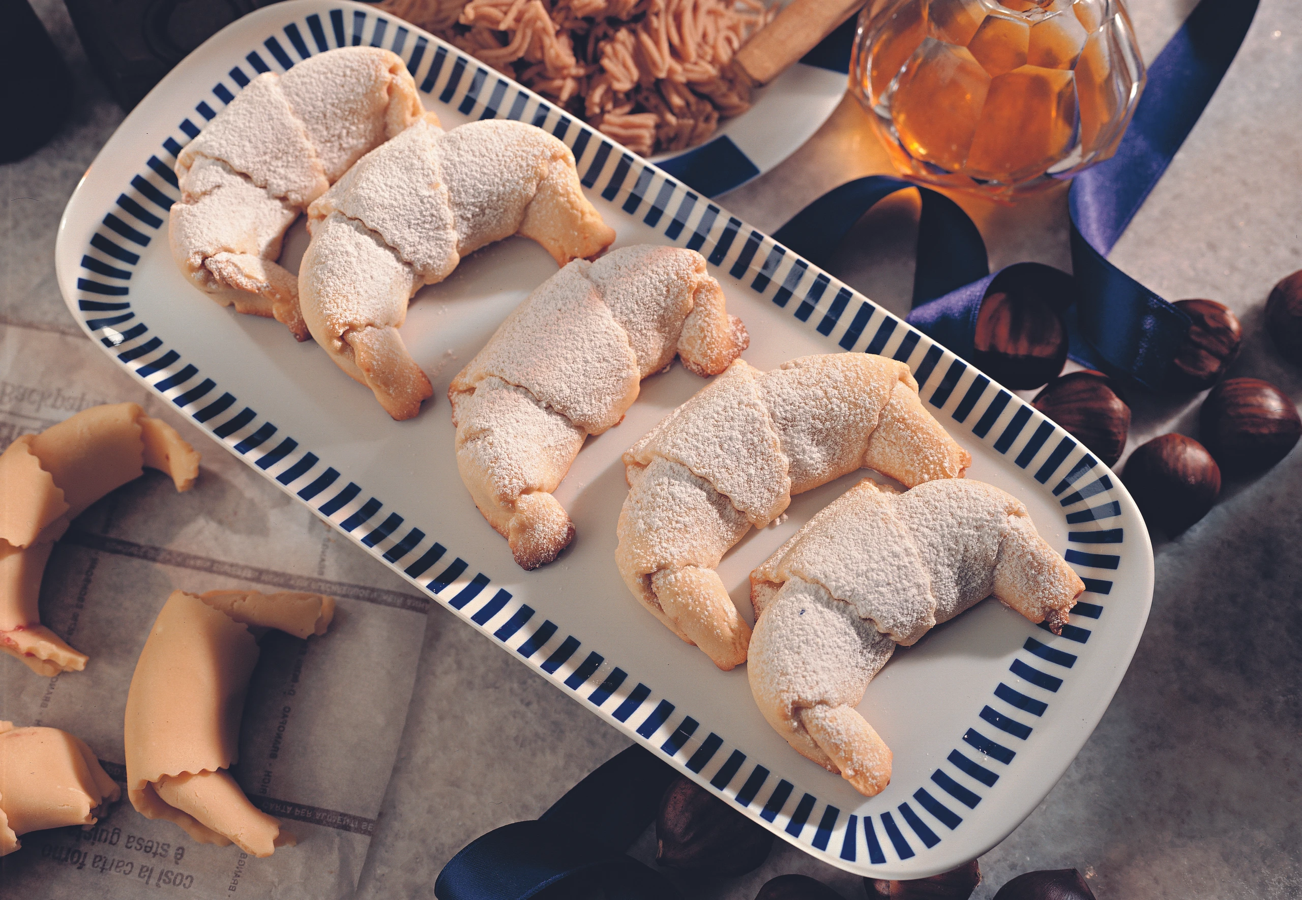 In die Mitte der Teigdreiecke je einen Tupfer Marmelade setzen, Maronifülle darauflegen. Teigdreiecke über die Fülle von der Grundlinie zur Spitze hin aufrollen und zu Kipferln formen.