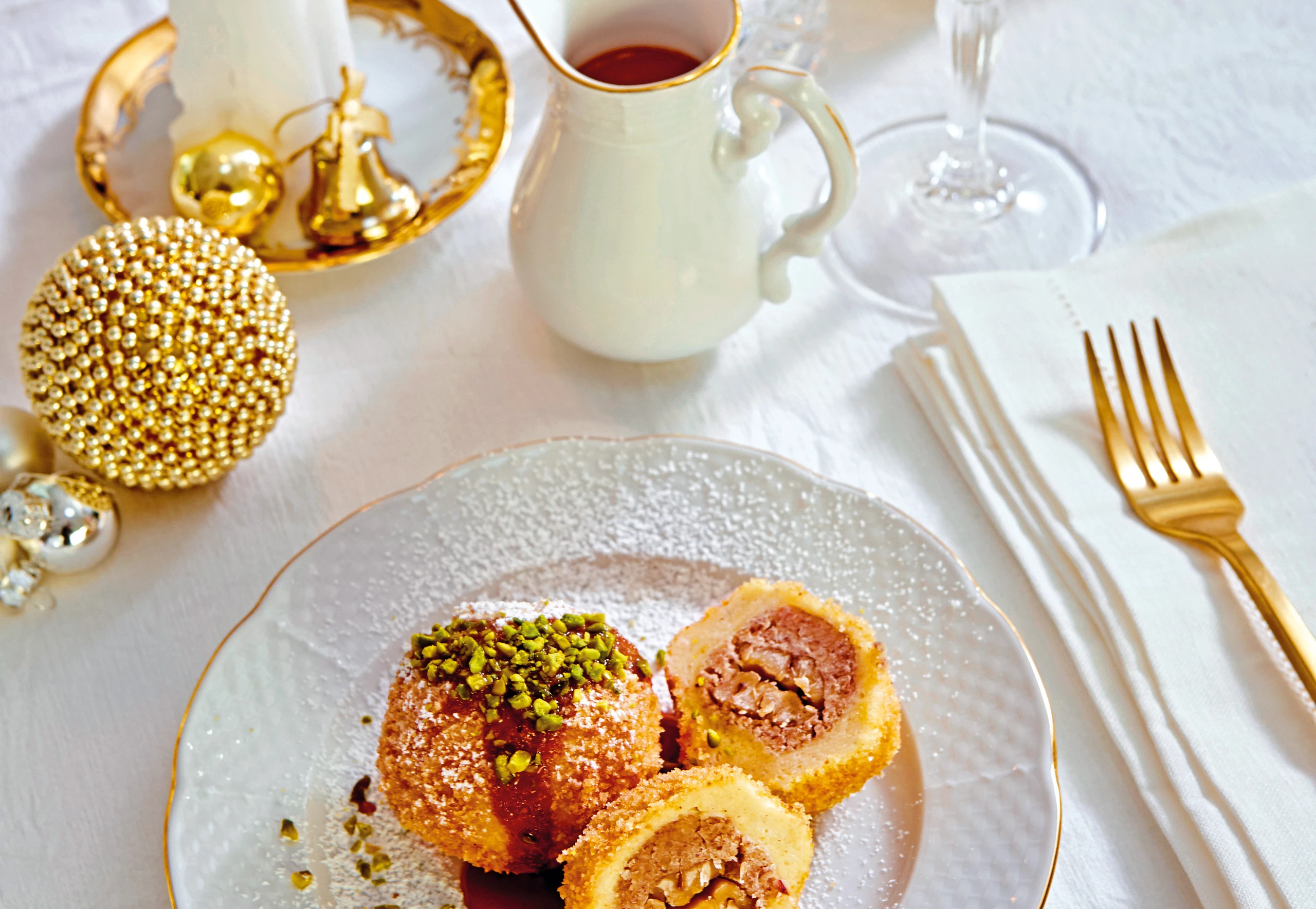 Maroniknödel mit Butterbröseln, Pistazien und Nougatsauce