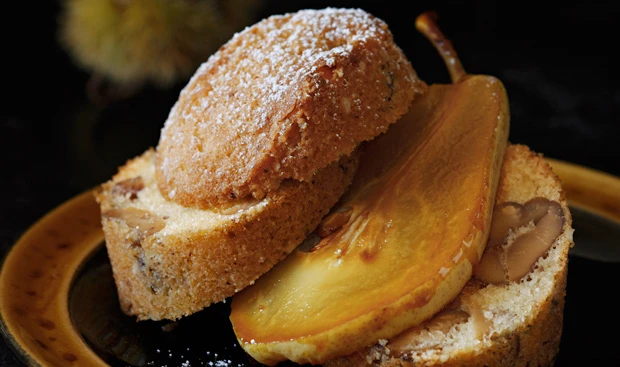 - Kuchen herausnehmen, ein wenig auskühlen lassen und aus den Formen stürzen. Kuchen horizontal dritteln, mit Staubzucker bestreuen und mit je 1 Birnenscheibe garniert servieren.