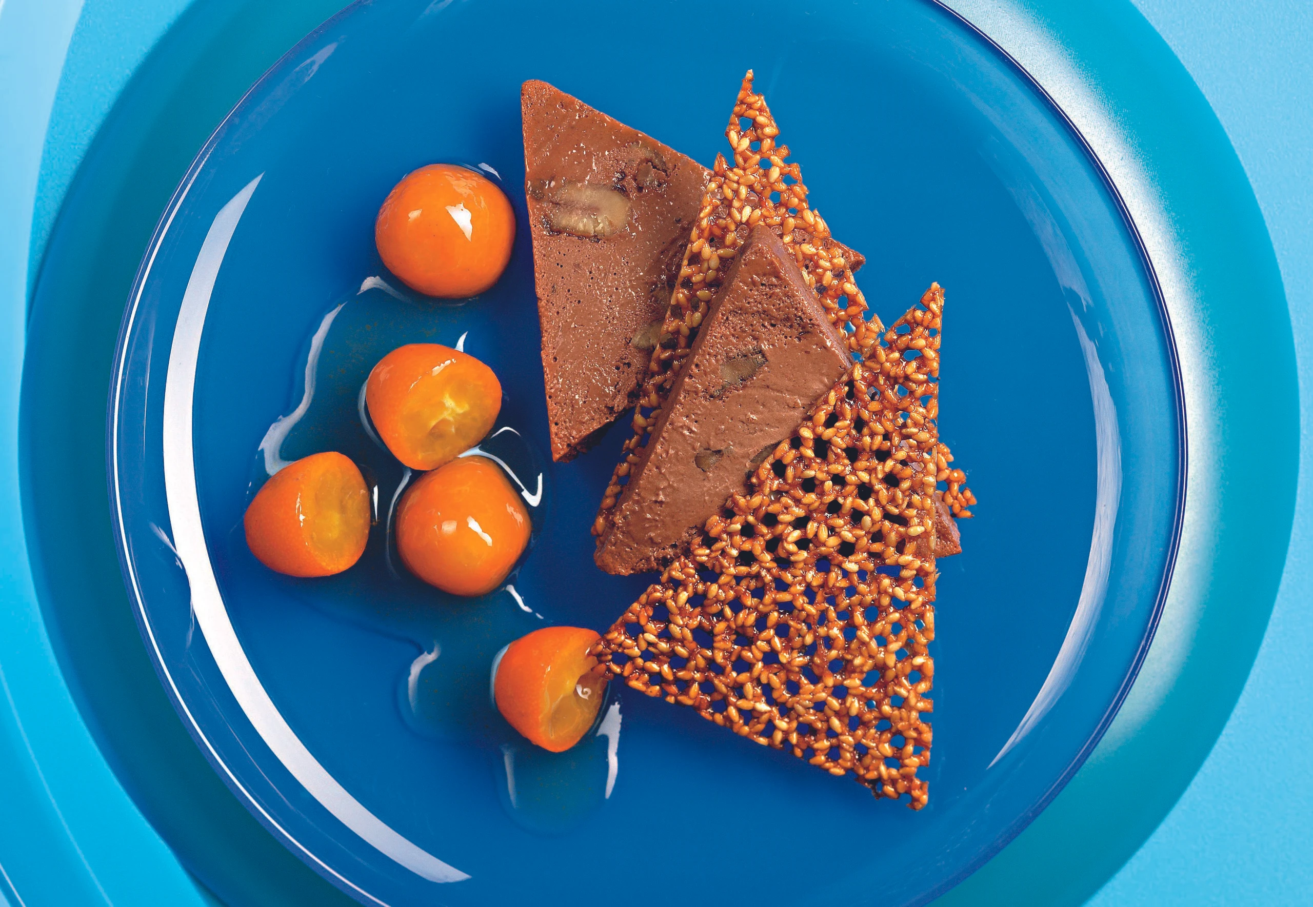 Parfait aus der Form stürzen, in Scheiben schneiden, mit Kumquats und Hippen servieren.