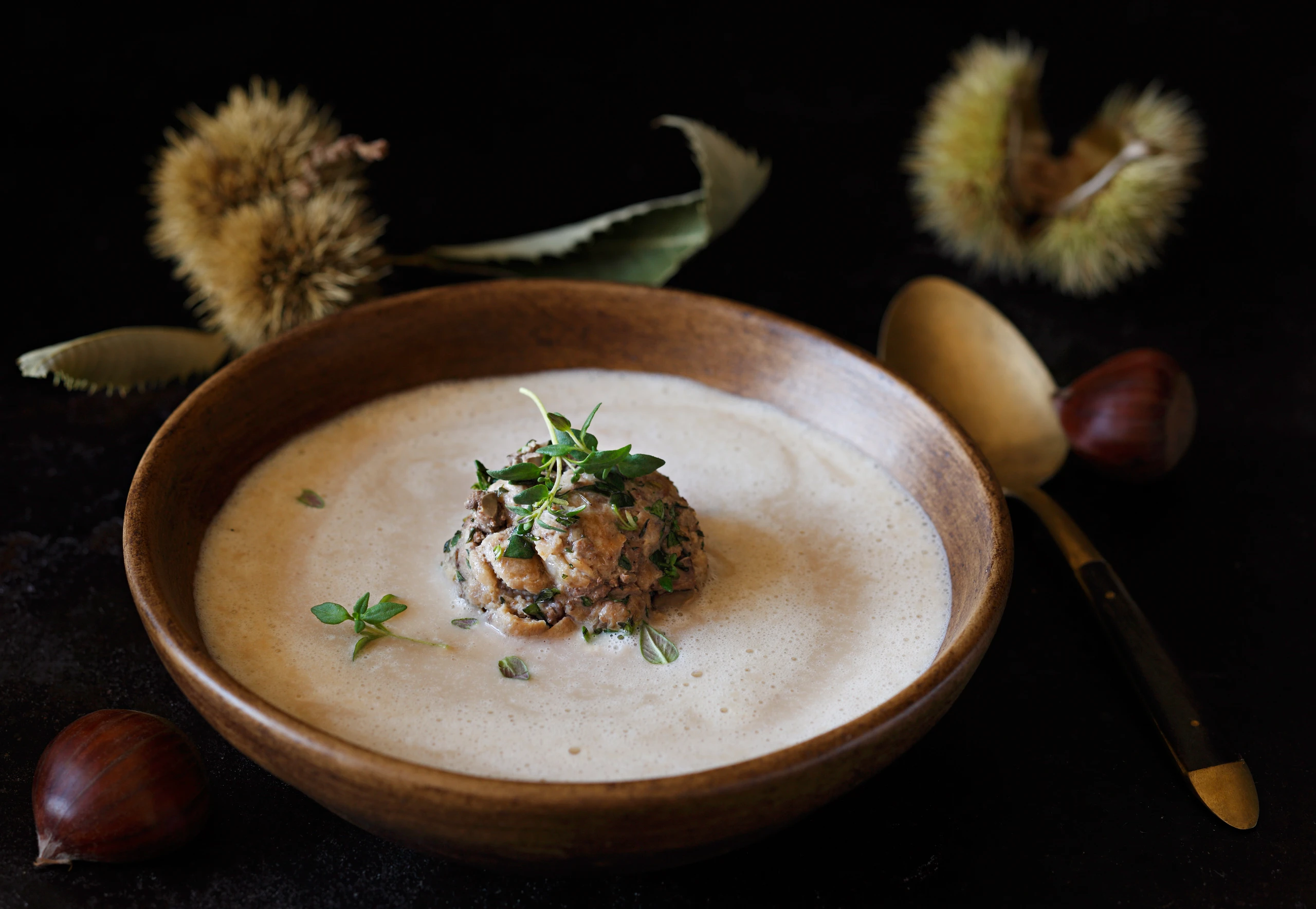 Für die Suppe Maroni klein schneiden. In einer beschichteten Pfanne Zucker schmelzen, mit Wein aufgießen und etwas einkochen. Maroni und Suppe zugeben und bei mittlerer Hitze ca. 10 Minuten kochen. Obers einrühren, mit Orangenschale, Salz und Pfeffer würzen. Butter einrühren, Suppe mit dem Stabmixer aufschäumen.