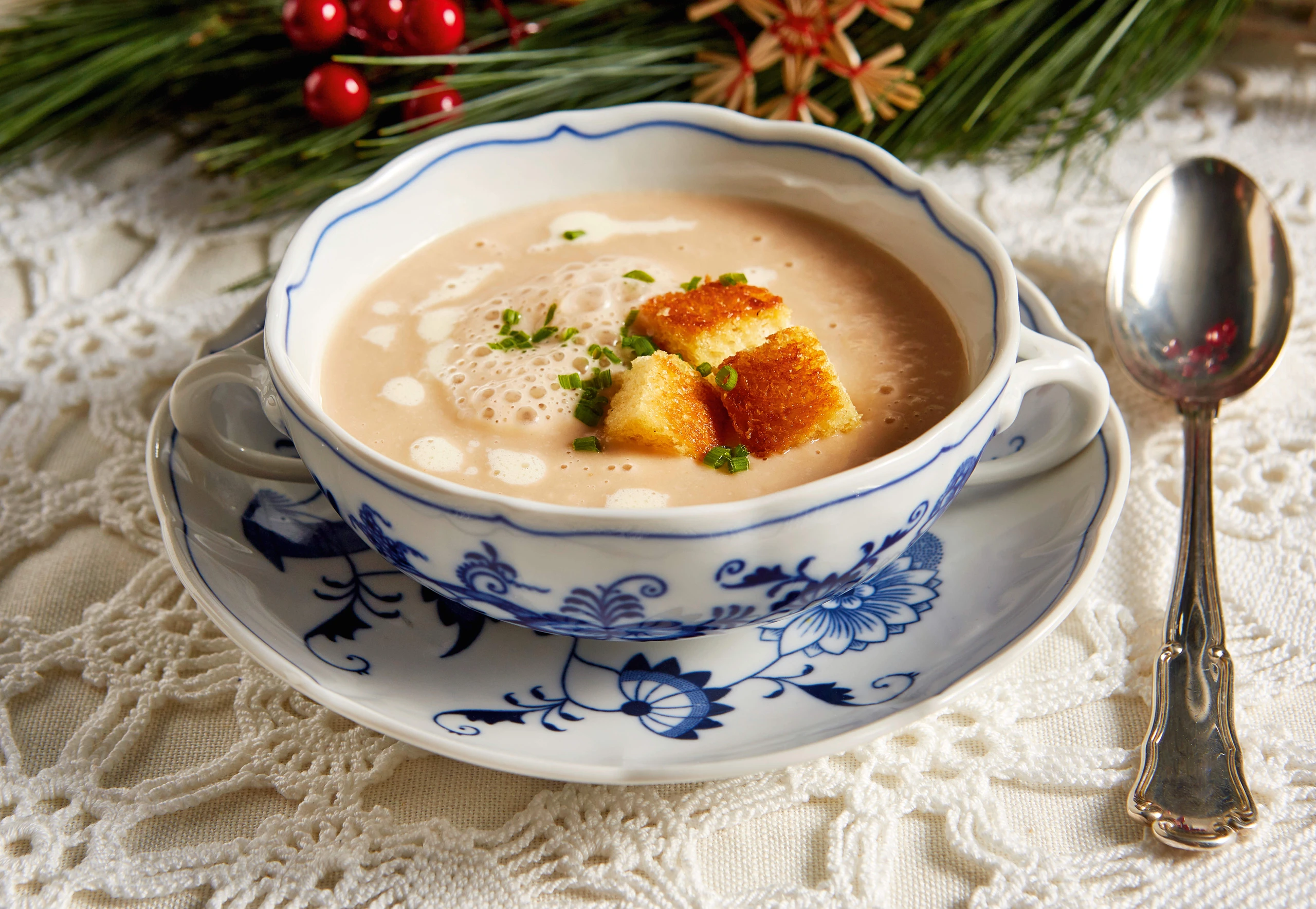 Suppe bis auf ein paar Esslöffel anrichten, übrige Suppe nochmals stark aufmixen, sodass Luftbläschen entstehen. Schaum vorsichtig mit einem Löffel in den Schalen verteilen. Suppe mit etwas Obers, Briochewürfeln und Schnittlauchröllchen servieren.