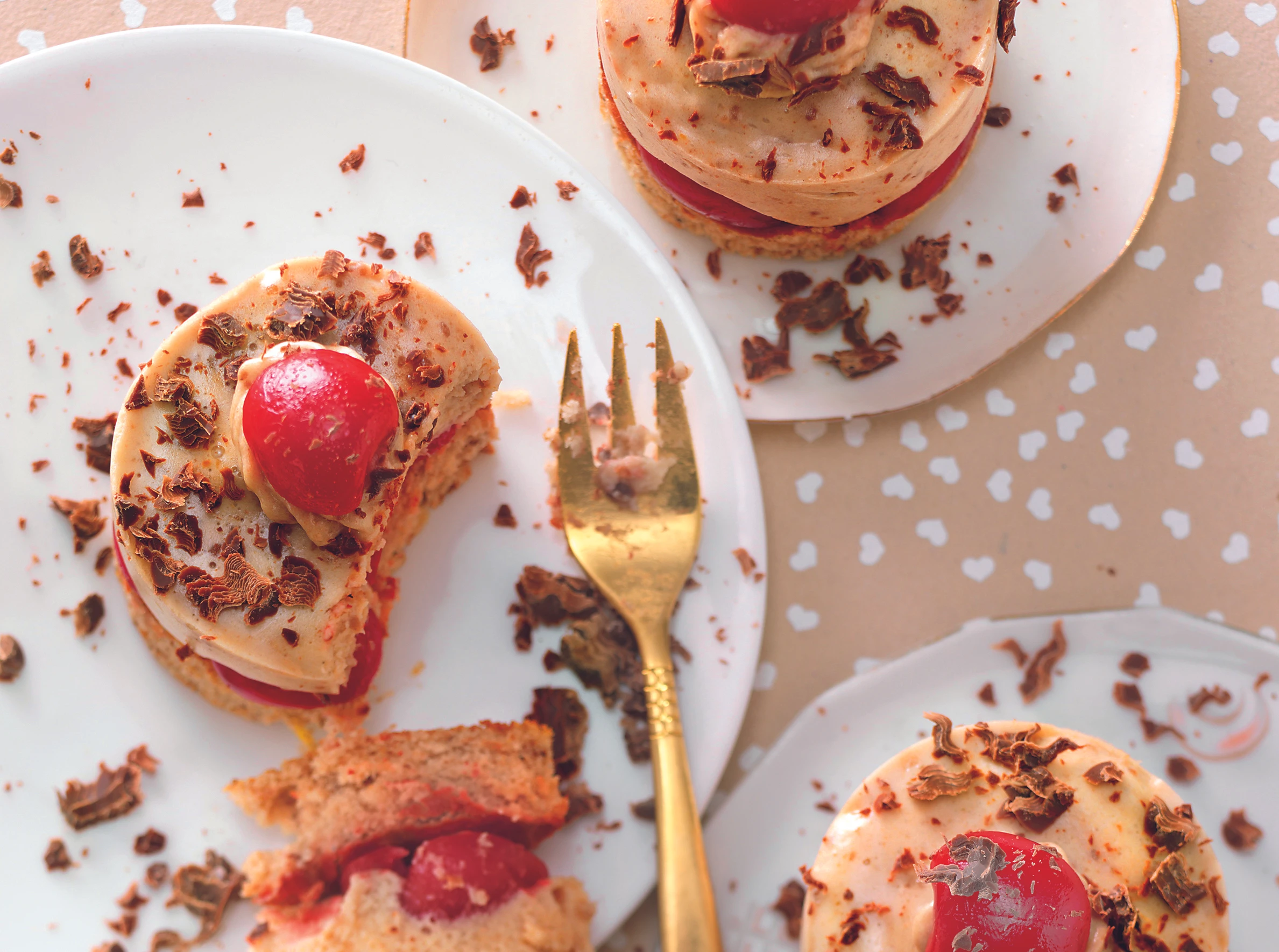 Frischhaltefolie von den Törtchen entfernen, Ringe abheben und die dicke Folie entfernen. Törtchen mit übriger Maronicreme, Kirschen und Kuvertüre garnieren.