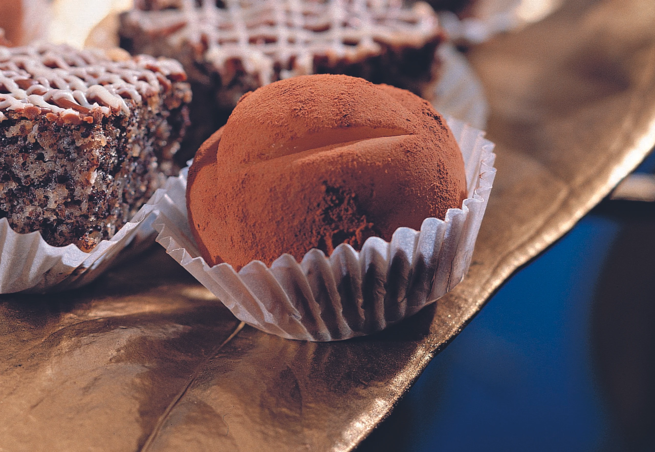 Die Marzipanstücke flach drücken und mit je einem Stück Schokolade-Fülle belegen. Schokolade mit Marzipan umhüllen und glatte Kugeln formen. Kugeln in Kakao wälzen, anschließend mit einem kleinen Messer eine Erdäpfel-Struktur einkerben. Marzipan-Erdäpfel in kleine Papier-Manschetten setzen.