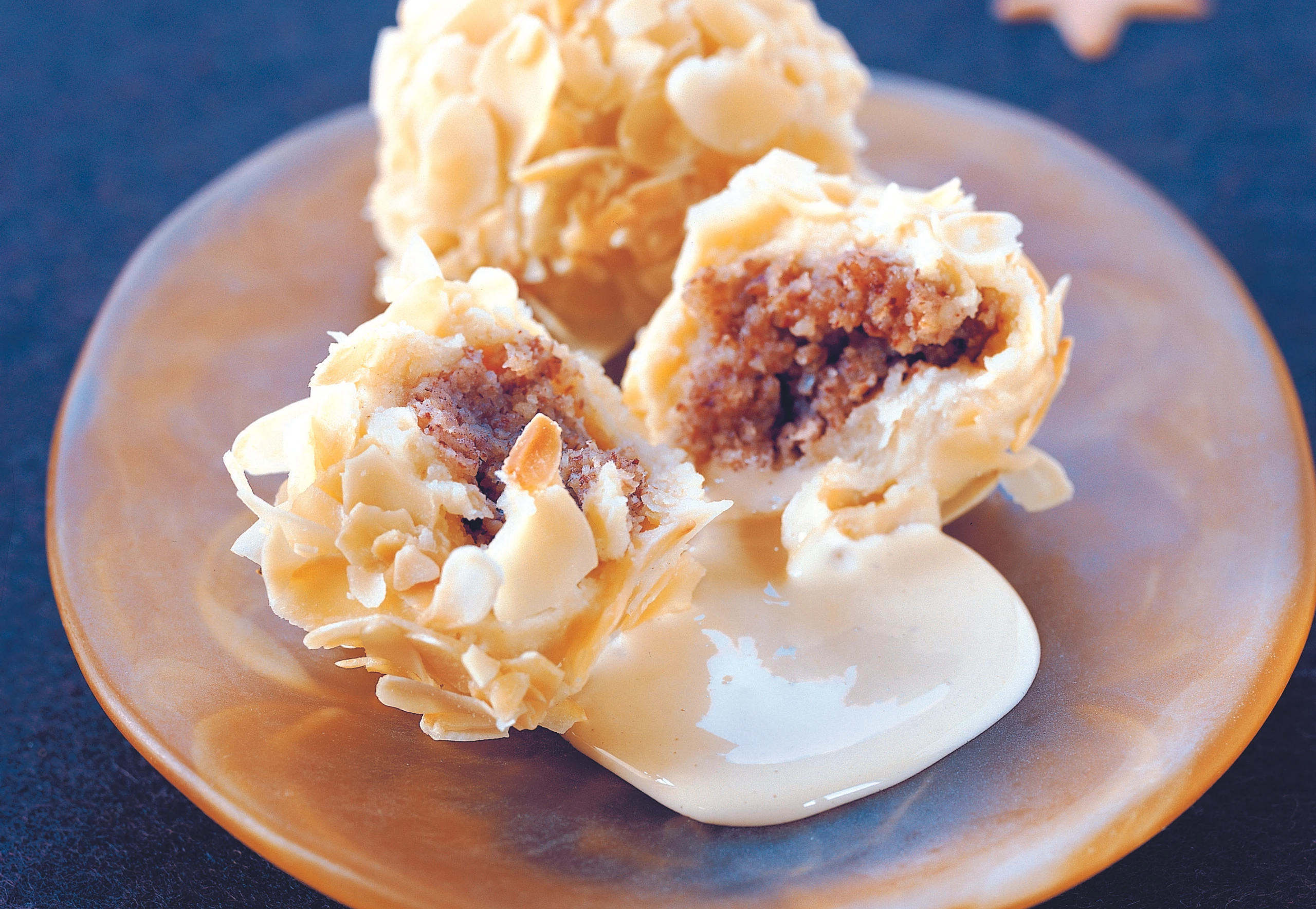 Für die Fülle Milch mit Zucker und Marzipan verrühren und aufkochen. Nüsse und Zimt einrühren und unter Rühren kurz rösten. Masse vom Herd nehmen, Amaretto untermischen.