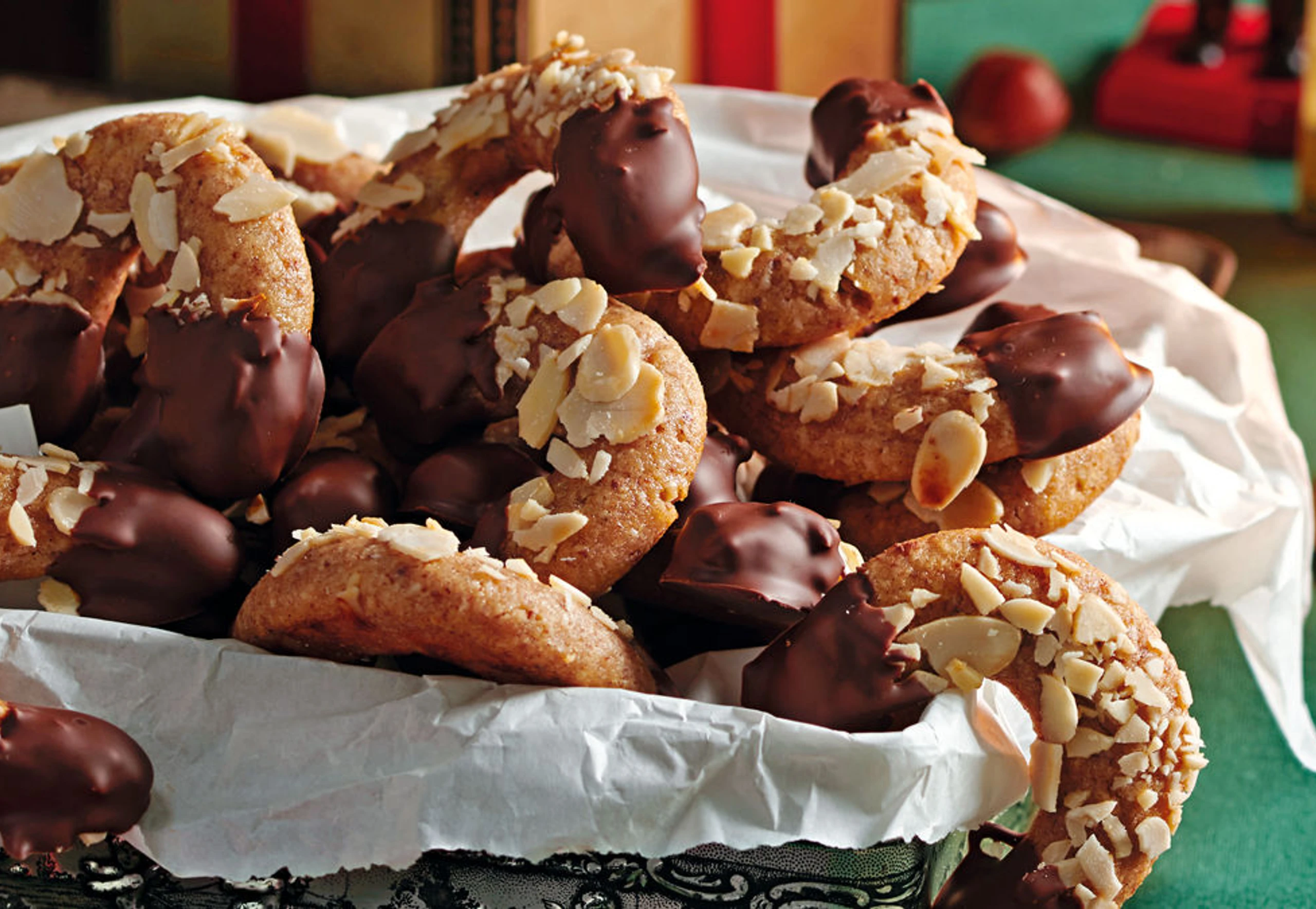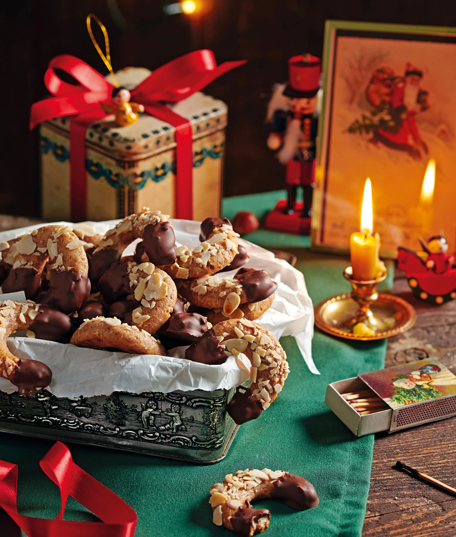 Kipferlenden in die Kuvertüre tunken und auf Backpapier trocknen lassen. Kipferl in einer Dose aufbewahren.