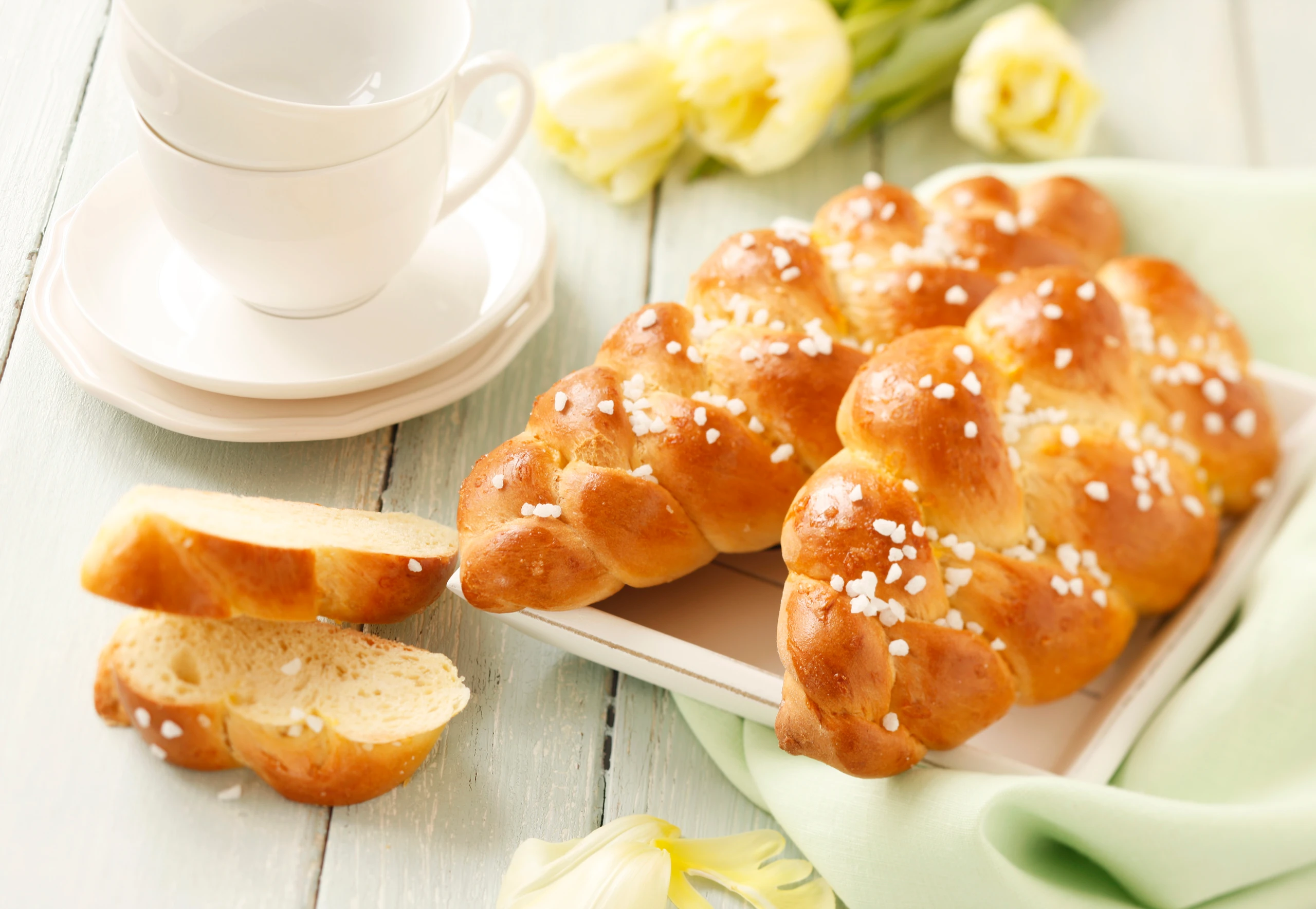 Rohr auf 180°C vorheizen. Zöpfe mit übrigem Dotter bestreichen, mit Hagelzucker bestreuen und im Rohr (mittlere Schiene) ca. 20 Minuten goldbraun backen.