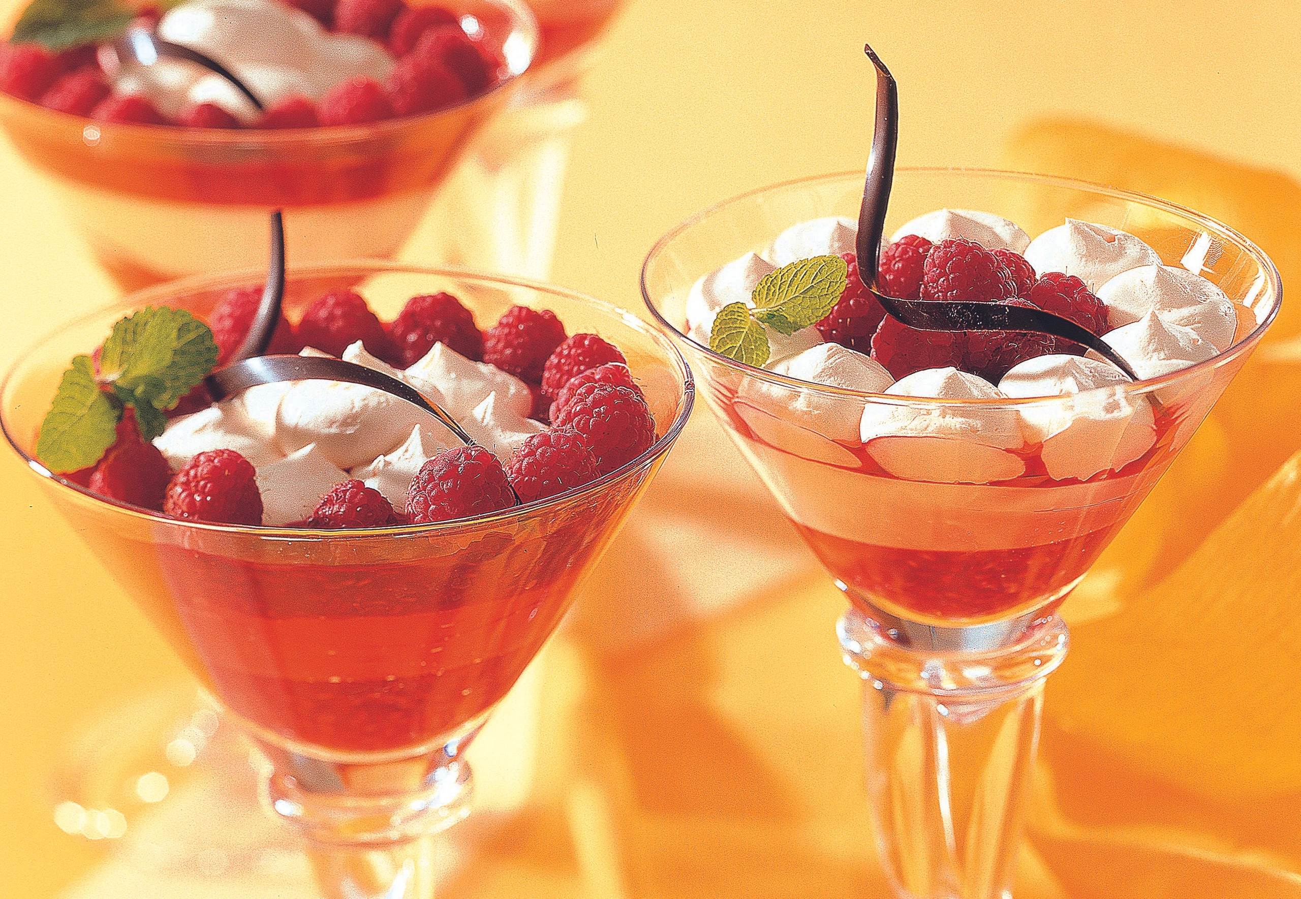 Mascarponecreme in einen Dressiersack mit glatter Tülle füllen, abwechselnd mit der Himbeersauce in gekühlten Gläsern anrichten.