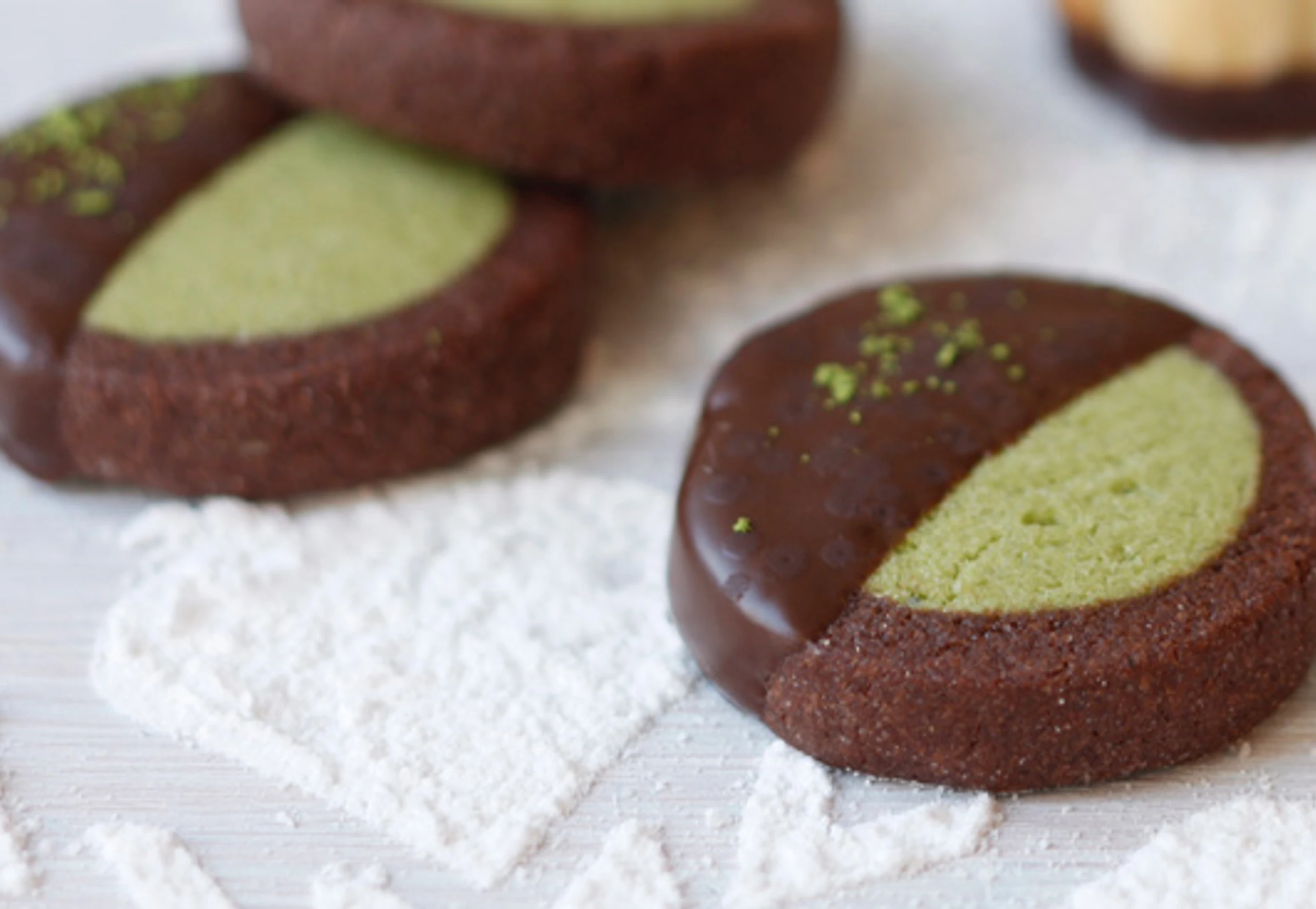 - Taler zur Hälfte in die Kuvertüre tauchen oder damit besprenkeln, auf Backpapier geben und trocknen lassen. Eventuell mit Matcha verzieren.